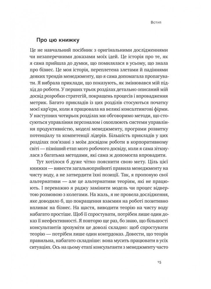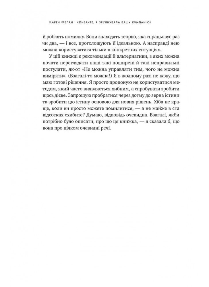 Про це розповідає консультантка з 30-річним досвідом Карен Фелан. Книжка авторки — щире зізнання, розвінчування міфів про теорії менеджменту, порадник, як будувати бізнес інакше, використати можливості, уникнути помилок і заощадити гроші. А ще — розповідь про цілком очевидне, але таке, що ми відмовляємося бачити.