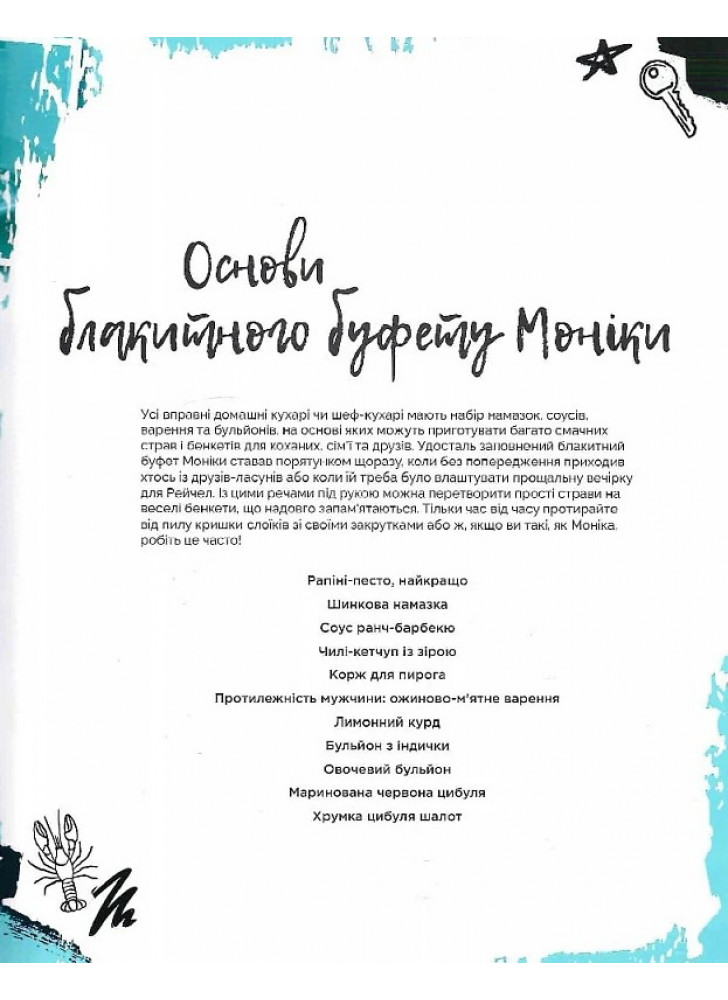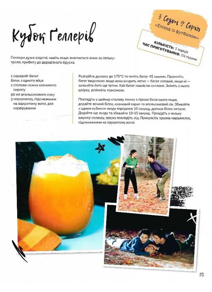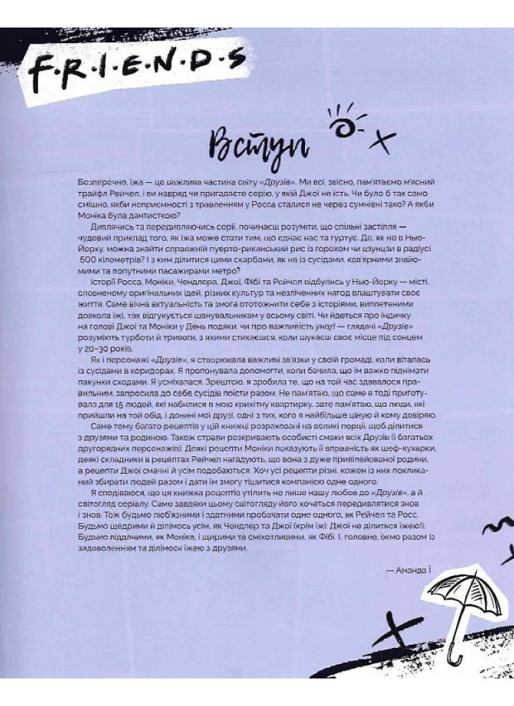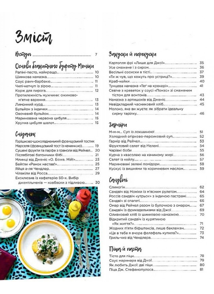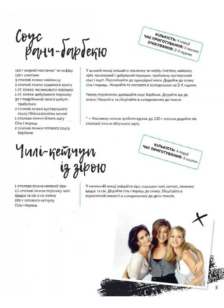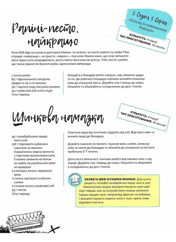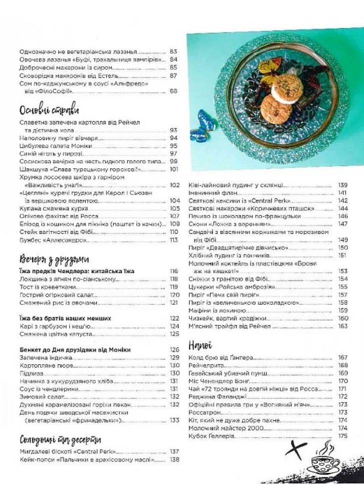Якщо ви досвідчений шеф, як Моніка Ґеллер, новачок у ресторанній справі, як Фібі Буффе, чи просто неабиякий поціновувач їжі, як Джої Тріббіані, ця книга рецептів за мотивами серіалу «Друзі» підкаже безліч цікавих страв для всякого кухаря!