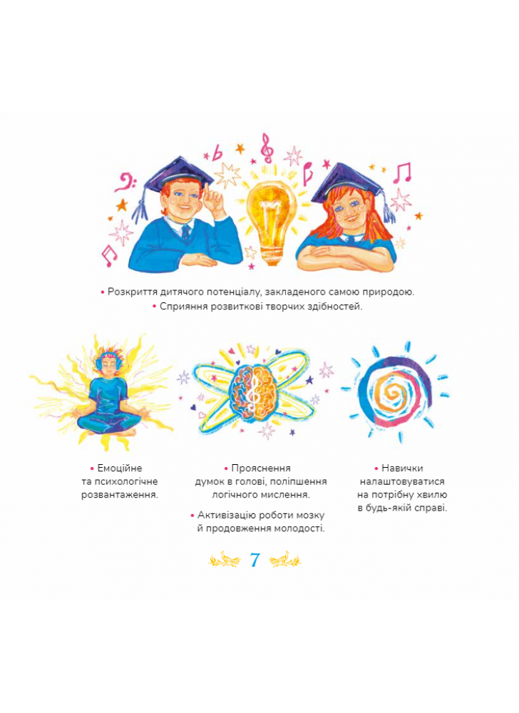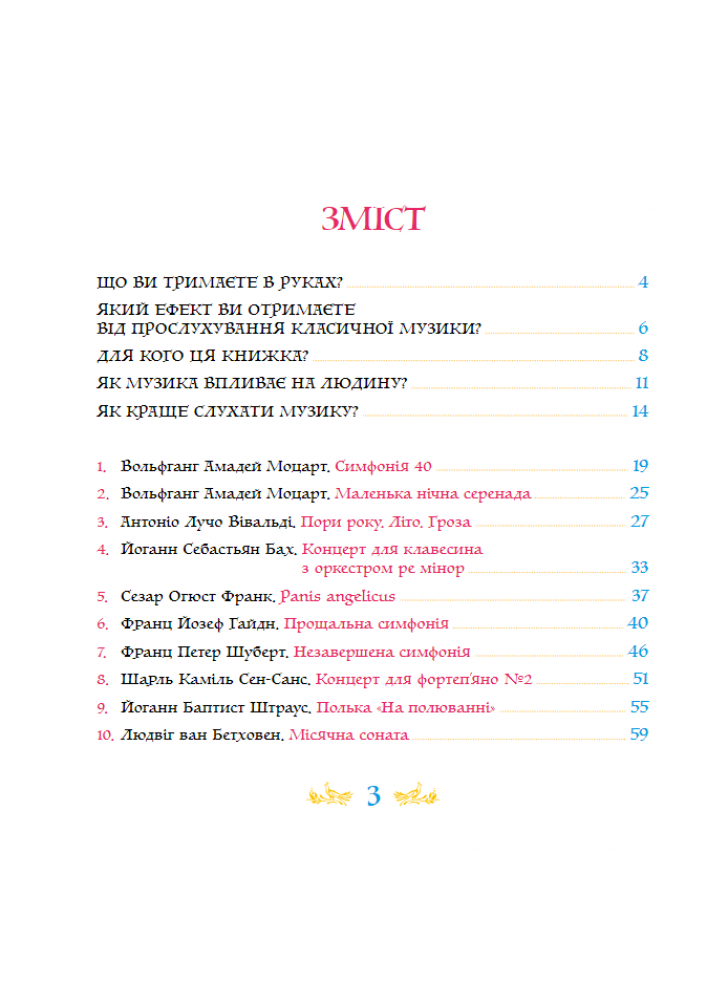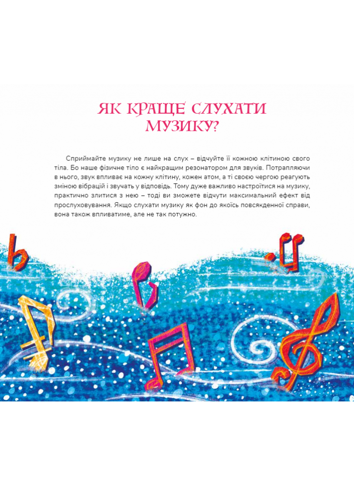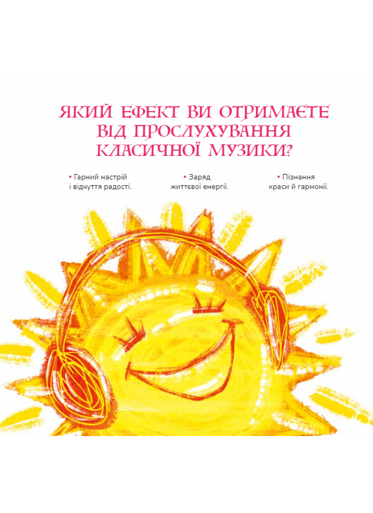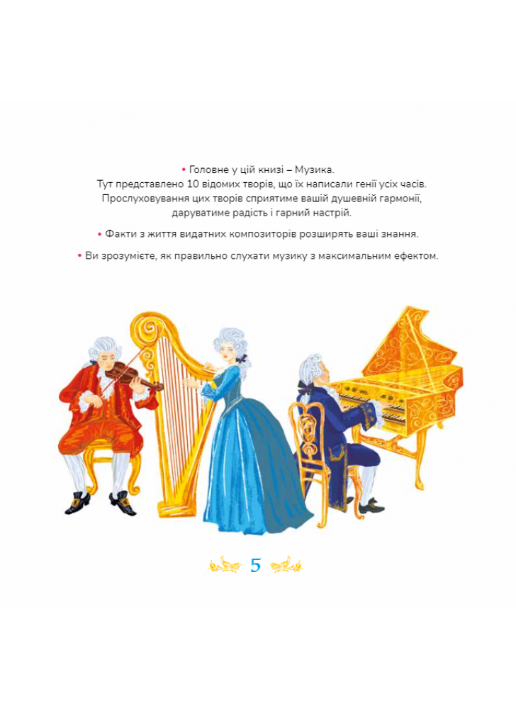 Класична музика пришвидшує утворення нових нейронних зв’язків у мозку, в результаті чого покращується пам’ять, розвиваються логіка і увага Прослуховування цих творів сприятиме відновленню душевної гармонії читача, принесе радість і гарний настрій. Книжка не має вікових обмежень. Музичні твори здатні заколисати немовля і розчулити бабусю, ілюстрації заворожать найвибагливішого тінейджера, тексти зацікавлять як школярів, так і дорослих.