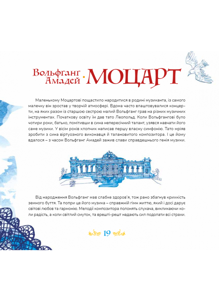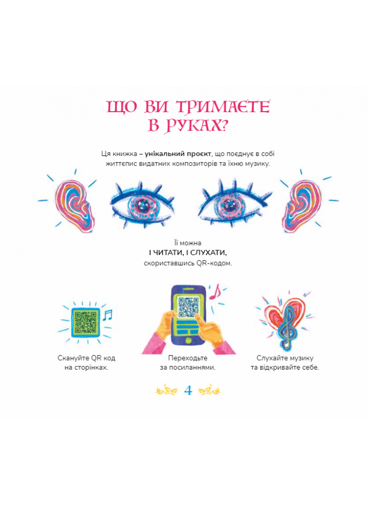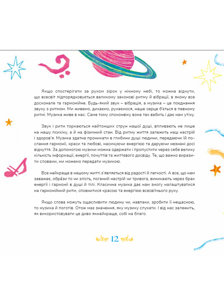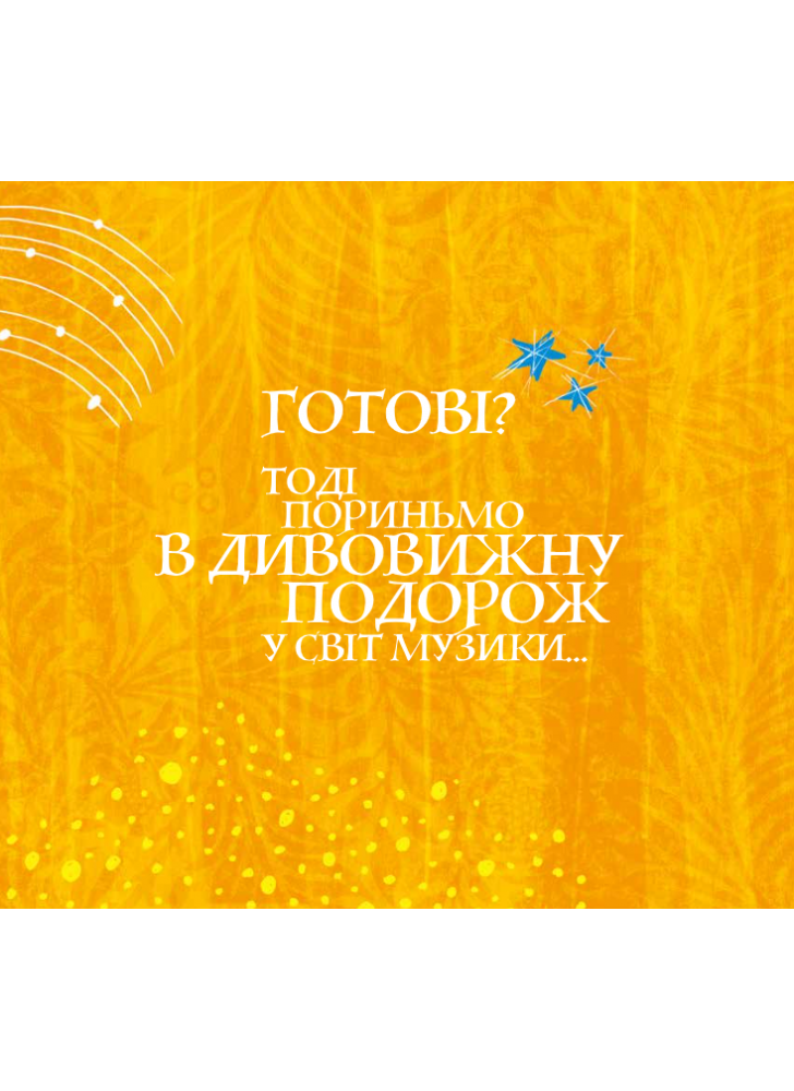 Унікальний проєкт для сімейного дозвілля, ілюстроване видання про Музику з аудіозаписами музичних творів. Видання “10 мелодій, що відкривають Всесвіт” містить цікаві факти з життя відомих композиторів, глибокі сучасні ілюстрації та 10 геніальних музичних творів. З її допомогою читач будь-якого віку матиме змогу відкрити для себе світ музики.