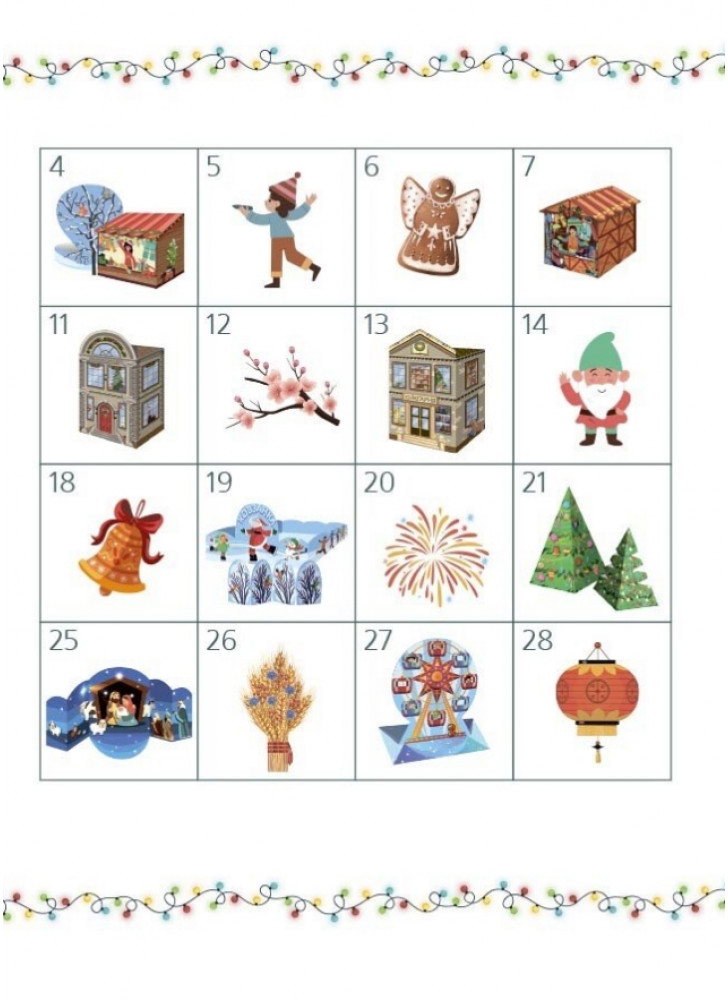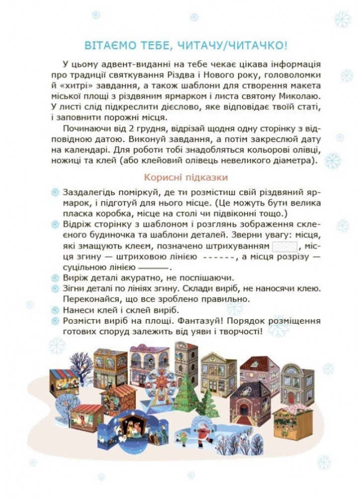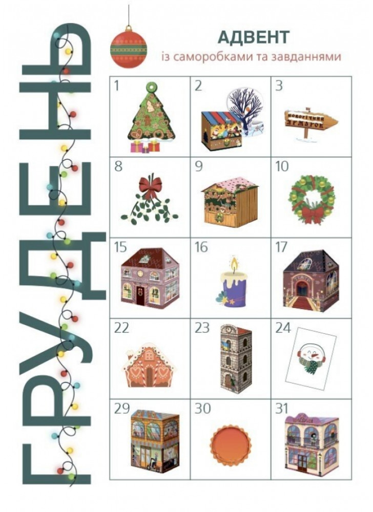Кожна саморобка перетворюється на макет будівлі з міської площі для різдвяного ярмарку, що стане окрасою вашої оселі на свята. Наш творчий адвент-зошит допоможе організувати сумісне родинне дозвілля та перетворити очікування свят на справжню зимову пригоду. Розгортайте адвент-зошит та створюйте дива власноруч!