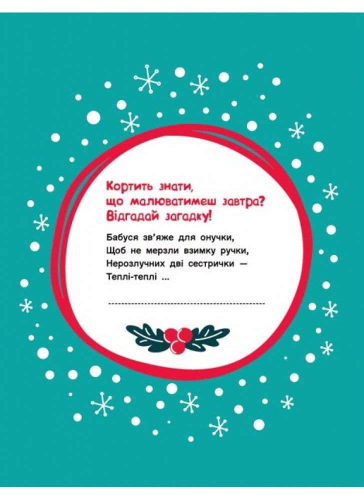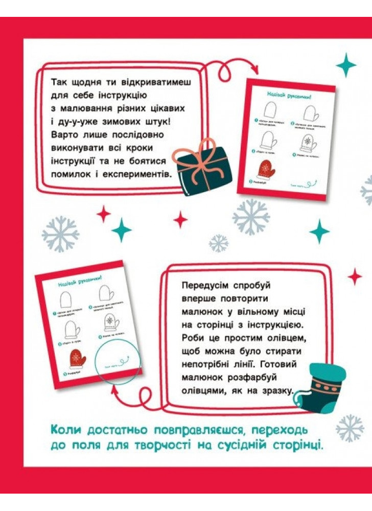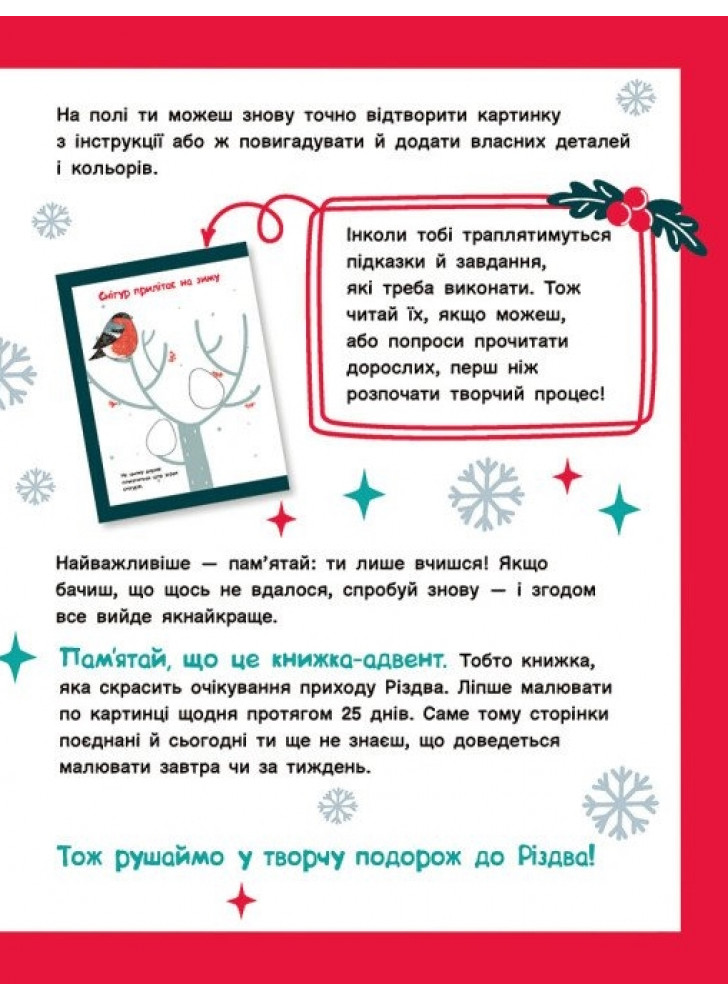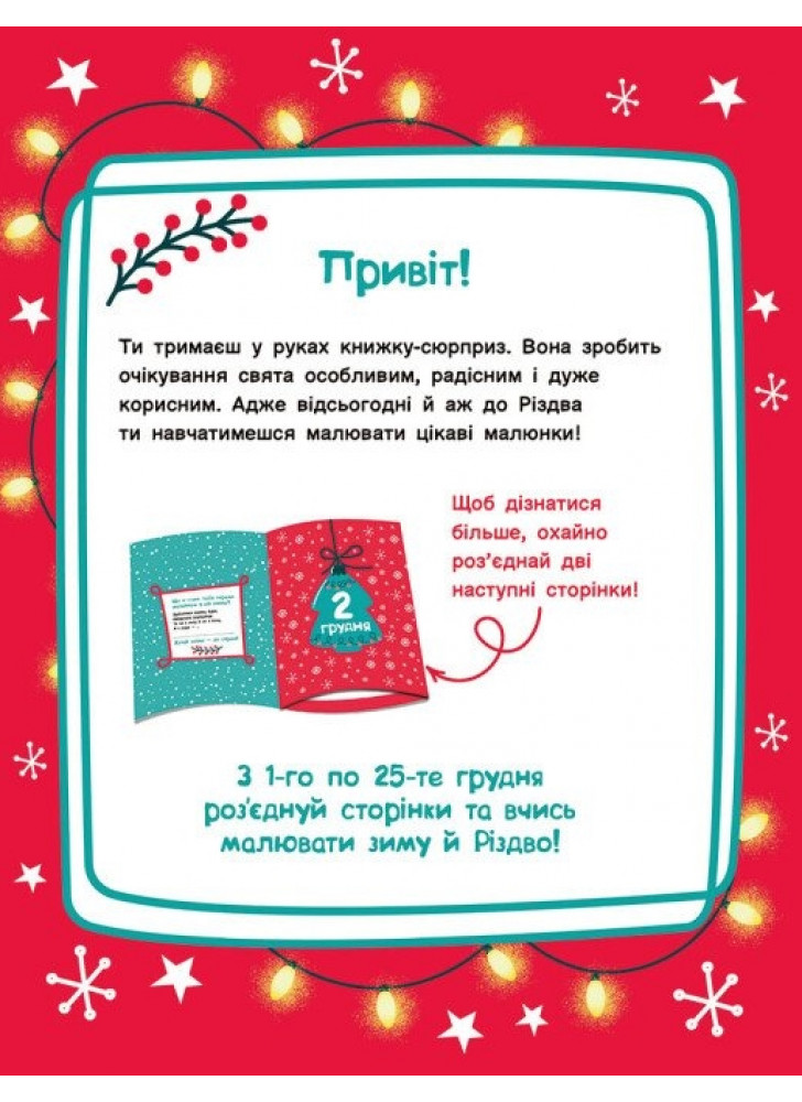 Зимові свята, які так обожнює малеча, уже зовсім скоро! А разом із ними — розваги й подарунки. Ну і як тут дочекатися?! Ця адвент-малювалка стане чудовим подарунком нетерплячим дітлахам і наблизить їх до святкування Різдва. Вона містить 25 покрокових інструкцій з малювання всіляких різдвяно-новорічних атрибутів на щодень: з 1-го по 25-те грудня.