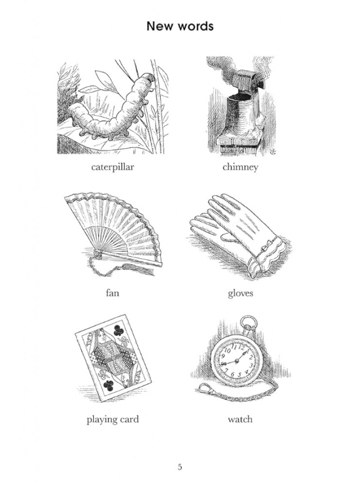 Книга добре проілюстрована — малюнки присутні майже на кожній сторінці. Аліса женеться за білим кроликом до Країни чудес. Там вона зустрічає Божевільного Капелюшника, Герцогиню та багатьох інших відомих персонажів і тварин у знаменитій історії Льюїса Керролла.