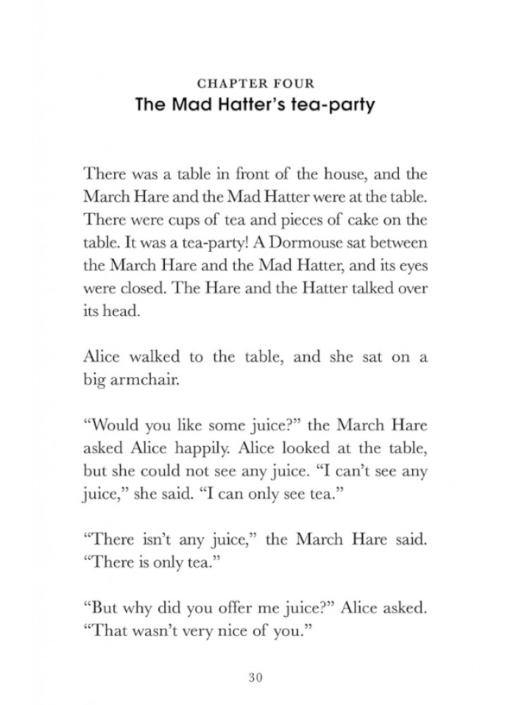 "Аліса в Країні чудес", Рівень 2, відповідає рівню A1+ за шкалою CEFR. Речення містять максимум дві частини, вводяться майбутні часи will та going to, теперішній тривалий час із майбутнім значенням, а також прикметники в вищому та найвищому ступенях.