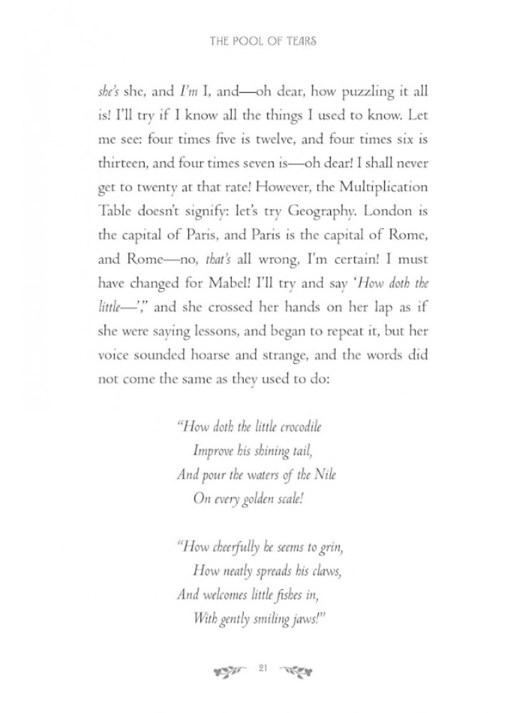 Чудове подарункове видання Пригод Аліси в Країні Див. Незмінна героїня, Аліса, — кмітлива, рішуча та винахідлива. У своїх надзвичайних пригодах вона зустрічає низку незабутніх персонажів — від владного Білого Кролика до усміхненого Чеширського Кота та Божевільного Капелюшника, усі з яких такі ж відомі, як і сама Аліса.