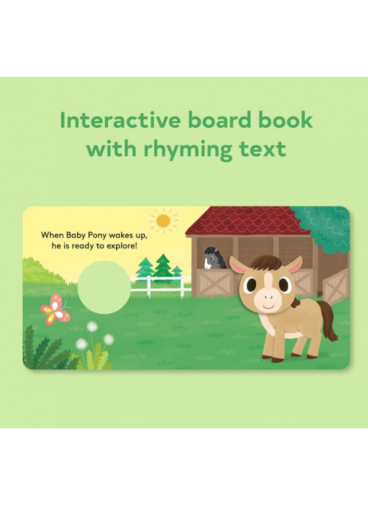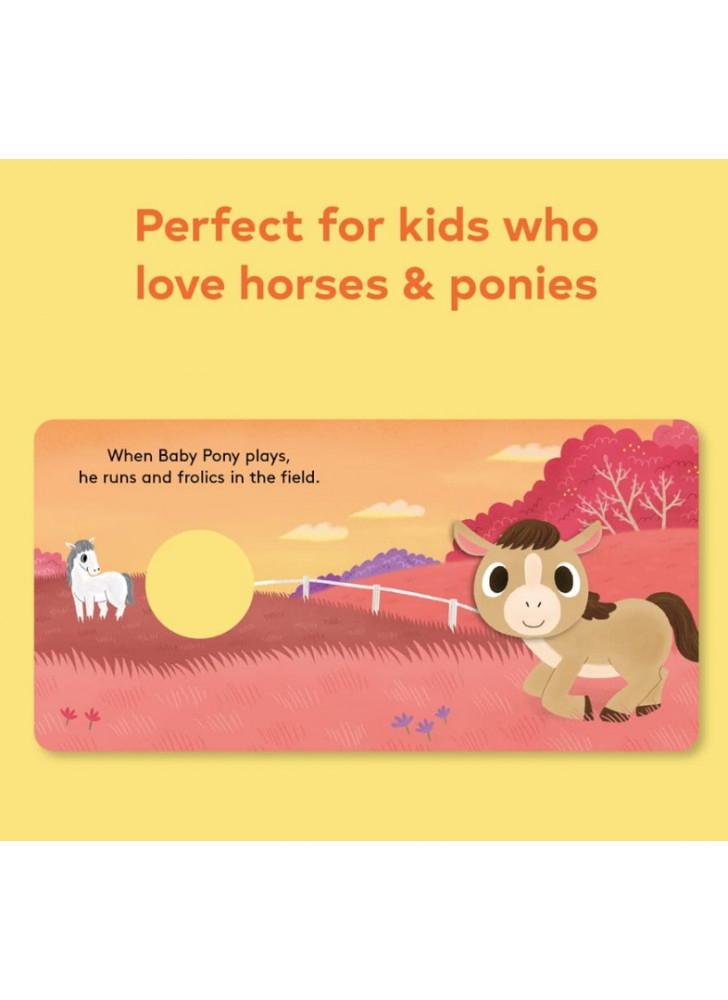 Малюк Поні пасеться, грається на лузі й затишно вмощується в стайні, коли настає час спати. У кожному ілюстрованому розвороті м’яка плюшева лялька, прикріплена до книжки, визирає з отвору, перетворюючи читання на веселу інтерактивну гру.