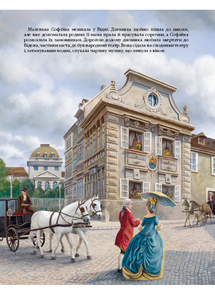 Це одна з найкращих дитячих книжок про музику. Маленька Софійка щойно пішла до школи у Відні, і вже допомагає своїй мамі — розносить замовникам попрані й випрасувані сорочки. Дорогою вона мало не щодня зупиняється біля театру, щоб послухати музику, яка ллється з вікон...