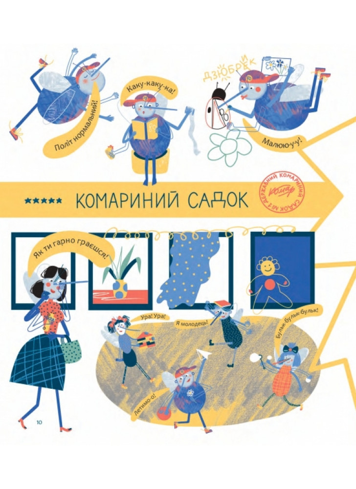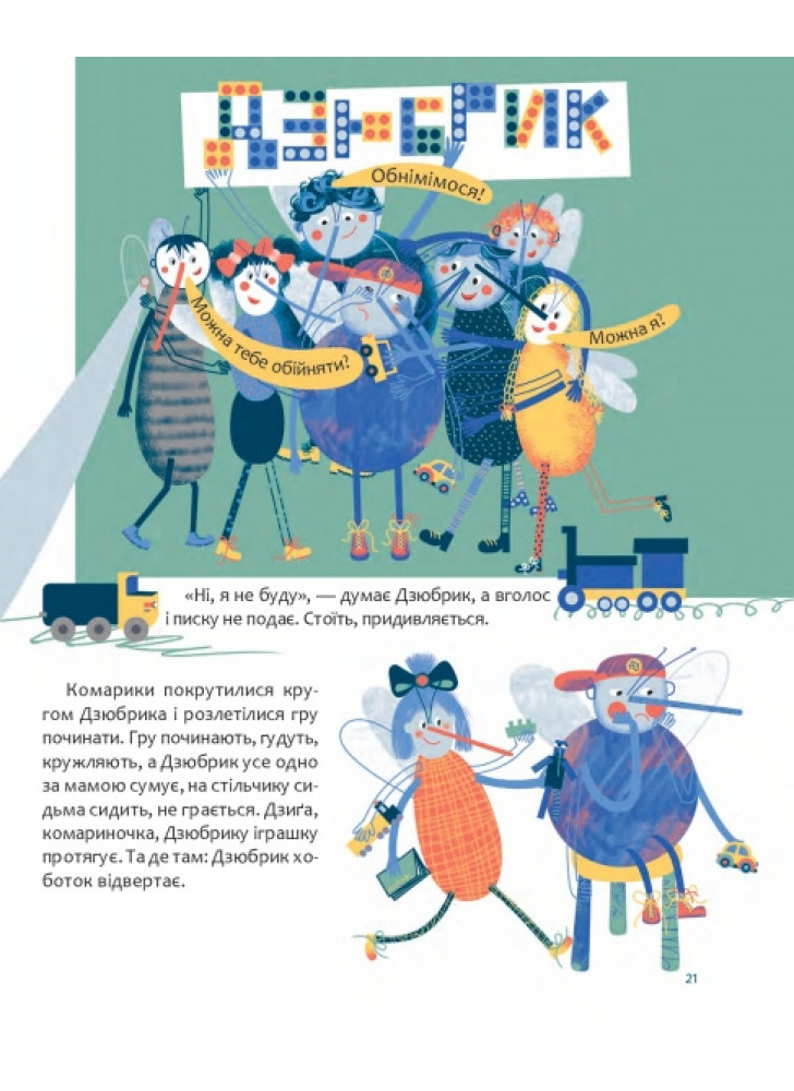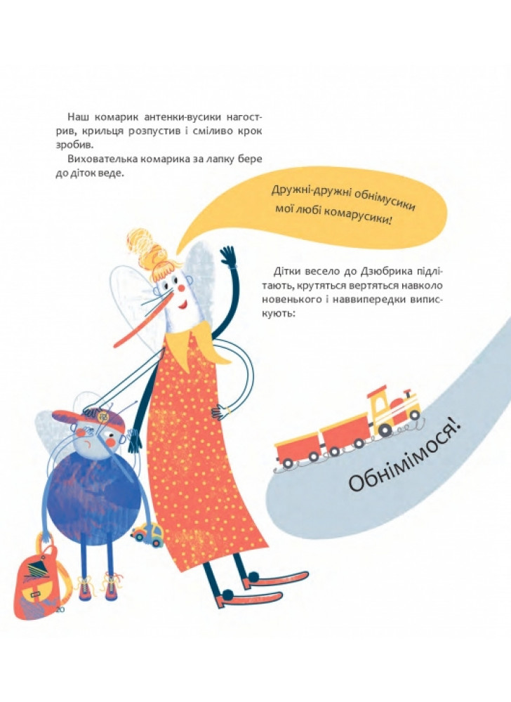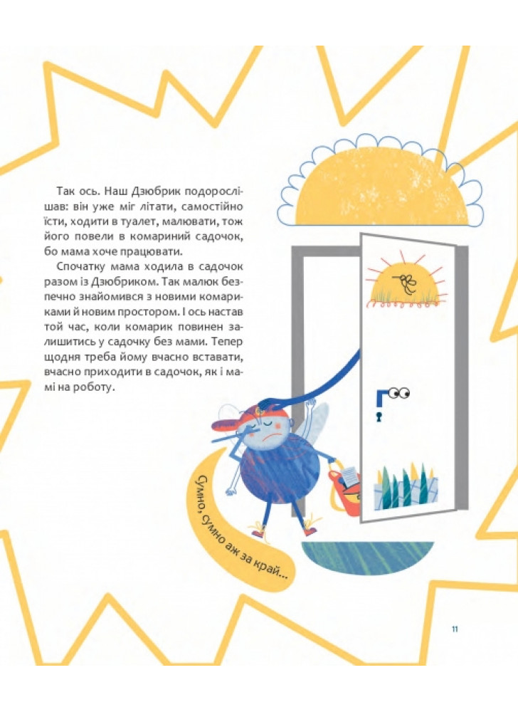 Комарик Дзюбрик, з одного боку, радіє, що буде гратися з іншими дітьми-комариками, а з іншого ‒ його лякає перспектива залишитися без мами, бо він ще не відчуває себе готовим до такого. Вибір головним героєм книжки саме комарика цікавий і несподіваний. Це може підштовхнути дитину до дослідження світу комах, до якого саме в ранньому віці малеча і так проявляє цікавість.