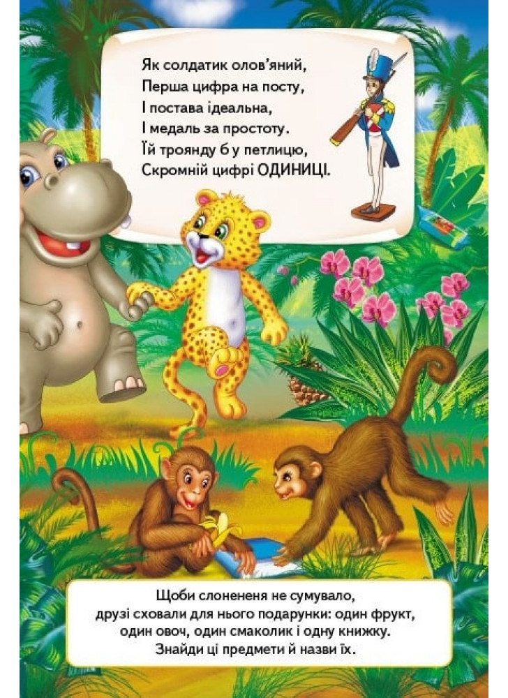 Щоб вивчити цифри від 0 до 10 — який вони мають вигляд, як вимовляються й пишуться, малюкові з цією книжкою зовсім не доведеться... вчити напам’ять цифри! Він просто спробує розвеселити сумного слона — адже той ОДИН. І також, мабуть, захоче скуштувати із зозулею у лелеки ДВА смаколики: ватрушку і халву. От би насправжки!