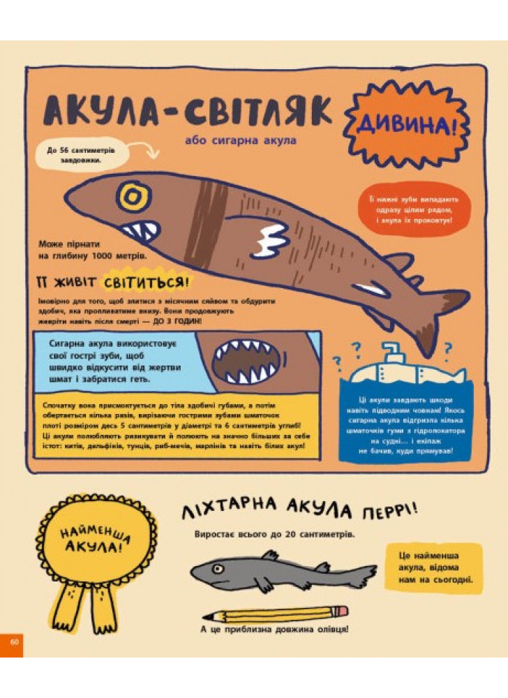Фанатієш від акул? Вдихни повітря — час ГЛИБШЕ зануритися в цю тему! Факти з книжки «Дещо потрясне про акул та інших підводних істот» не можуть не дивувати. От ти знав/-ла, що в океані плаває майже 20 тонн абсолютно НІЧИЙОГО золота? А що імовірність померти, вдавившись хотдогом, вища, ніж від нападу акули? Та навіть кокос на голову з більшою ймовірністю впаде! Художник Майк Ловері, який створив цю книжку, як і ти, фанат підводного життя, а ще неабиякий дотепник!