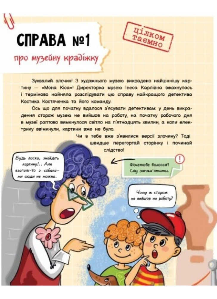 Зухвалий злочин! З художнього музею викрадено найціннішу картину! Але найкращий юний детектив Костик Костяченко зі своєю командою не дозволять злу панувати в місті. Допоможи детективам викрити злодія та захистити невинних. У цій книзі ти потрапиш у безліч локацій, де побував злочинець та намагався заплутати сліди.