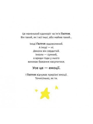 Ґастон — це малий єдиноріг. Він такий, як і всі інші, або майже такий… Його веселкова грива змінює барви залежно від того, яку емоцію він відчуває! Сьогодні Ґастон засмучений. Він посварився зі своїми друзями. Дізнайся, як йому вдалося повернути собі добрий настрій! Ці історії навчать висловлювати свої емоції і керувати ними.