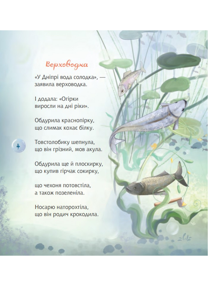 Збитошні, а часом і відверто іронічні вірші Анатолія Дністрового знайомлять юних читачів зі світом дніпровських риб. Добре знані верховодки, карасі й окуні, поважні лини, щуки й соми та рідкісні, відомі хіба найзатятішим рибалкам білоочки, чехоні й гoловні зображені напрочуд характерно, зі своїми неповторними особливостями поведінки й смаків.