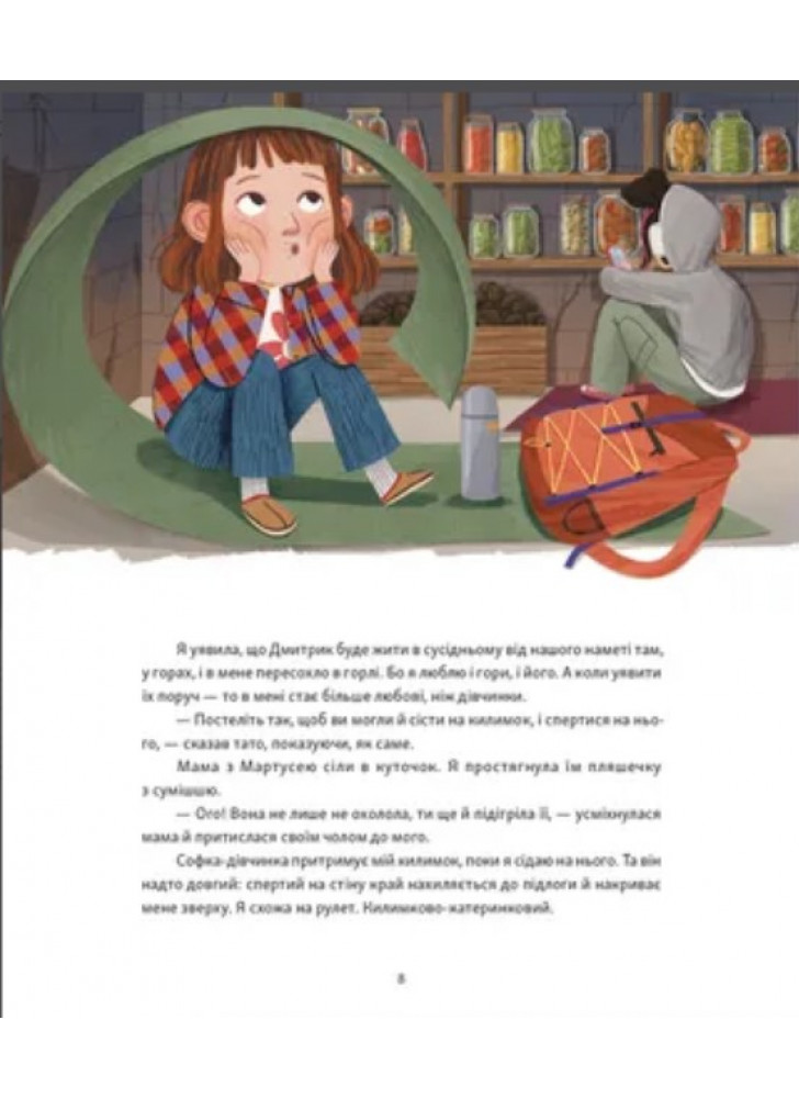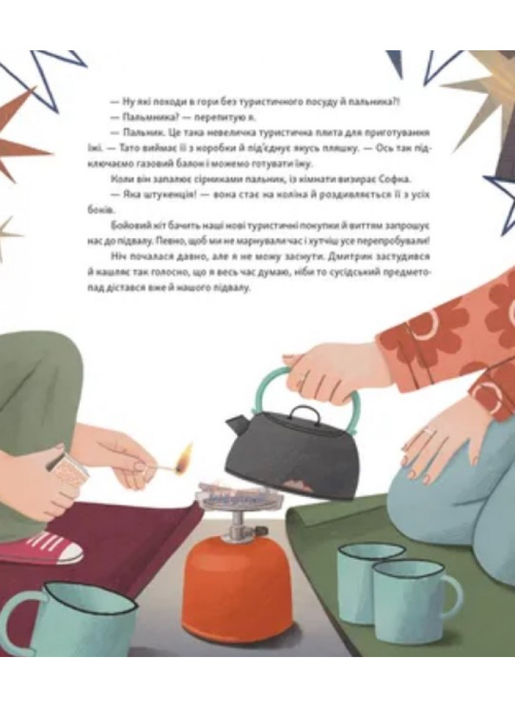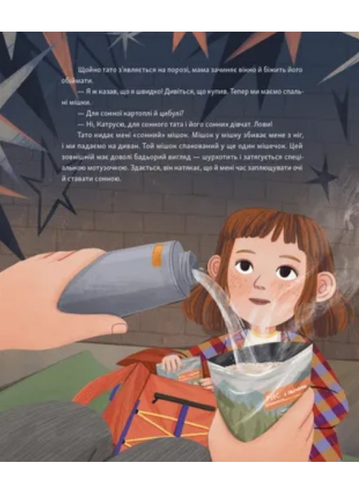 Коли в сім’ї люблять мандрувати, то нічого незвичайного немає у тому, щоб приготувати яблучну шарлотку в горах. Але до цього треба трохи підготуватися. Катрусин батько готує чималеньку родину до справжнього туристичного походу – для мандрів треба мати каримати, великий рюкзак з припасами, «сонний» мішок, а ще газовий балон.