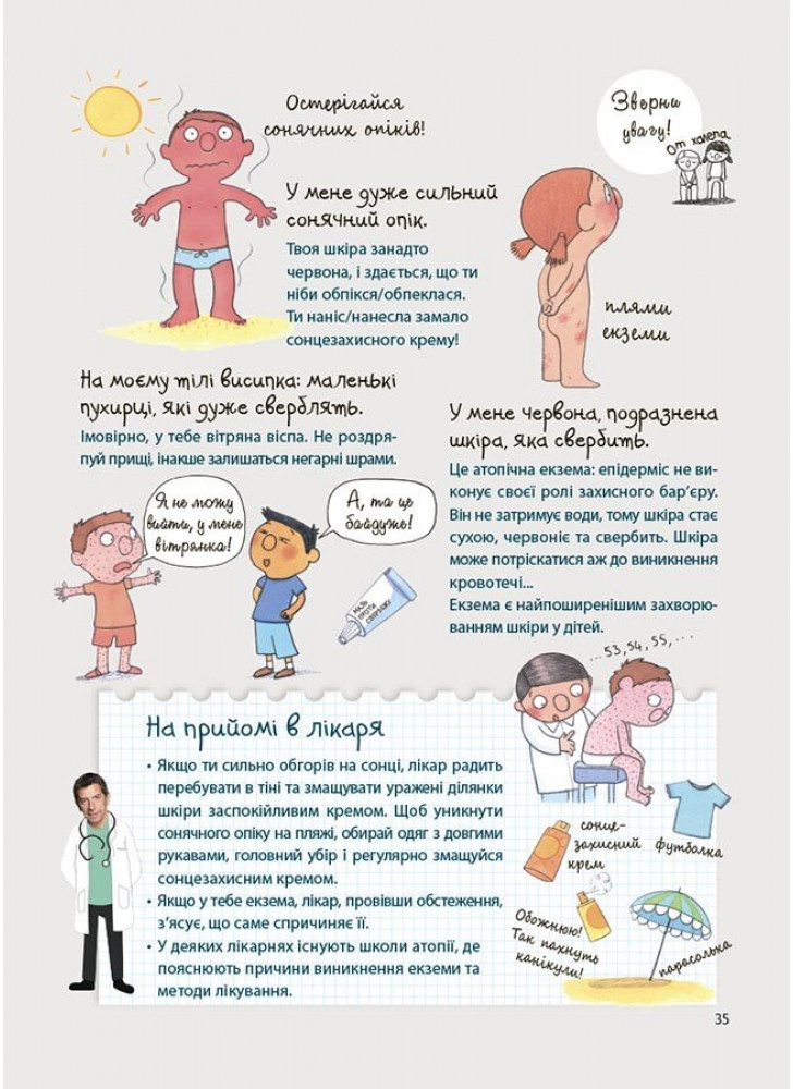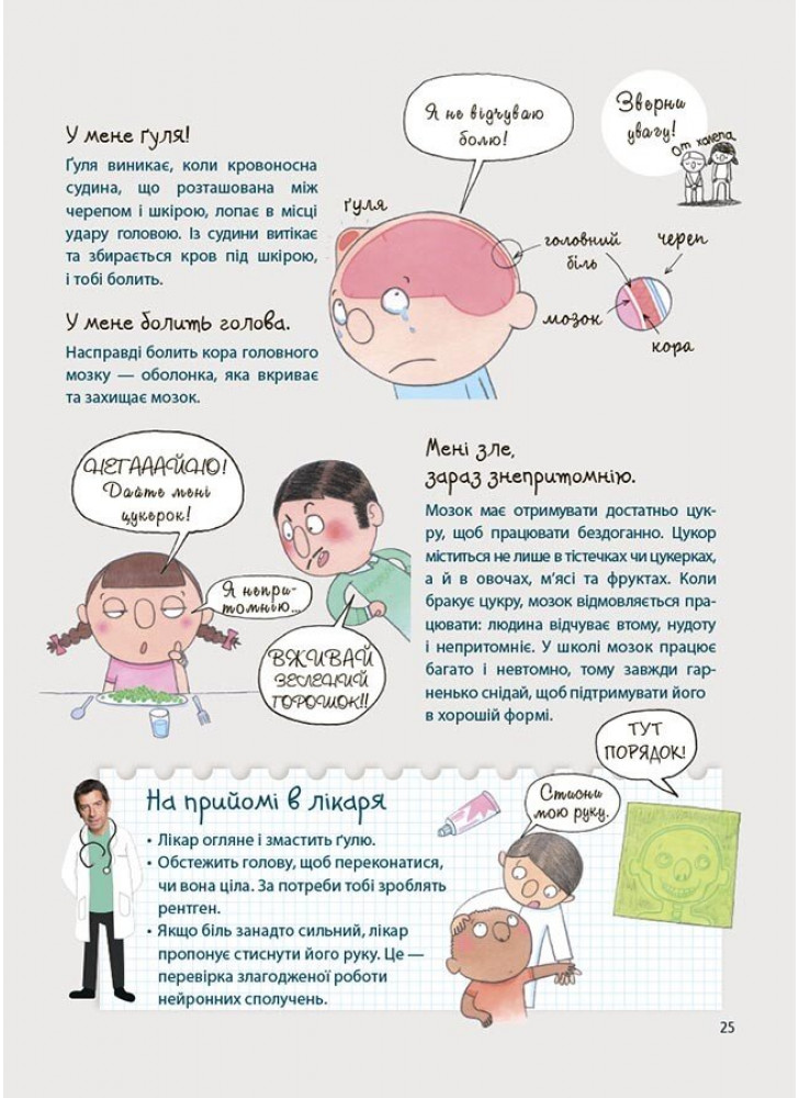 Рубрика «На прийомі у лікаря» особлива в цій книзі. Вона пояснює дитині, навіщо піклуватися про своє здоров’я, знайомить із різними фахівцями та допомагає подолати страх перед відвідуванням лікаря.Автор книги — відомий французький лікар і телевізійний ведучий Мішель Сімс, якого на створення книги надихнув 5-річний допитливий син.