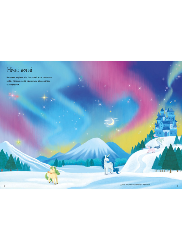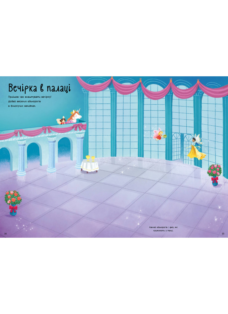 Наклеюйте стікери й створіть власні історії про казкових єдинорогів! Єдинороги бавляться в зачарованому лісі, влаштовують вечірки й навіть літають у зоряному небі! Понад 180 стікерів з єдинорогами та їхніми чарівними друзями подарують малюкові затишну й захопливу пригоду.