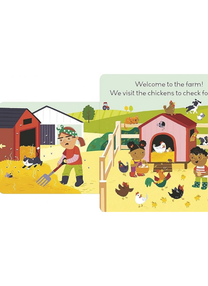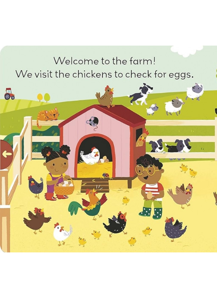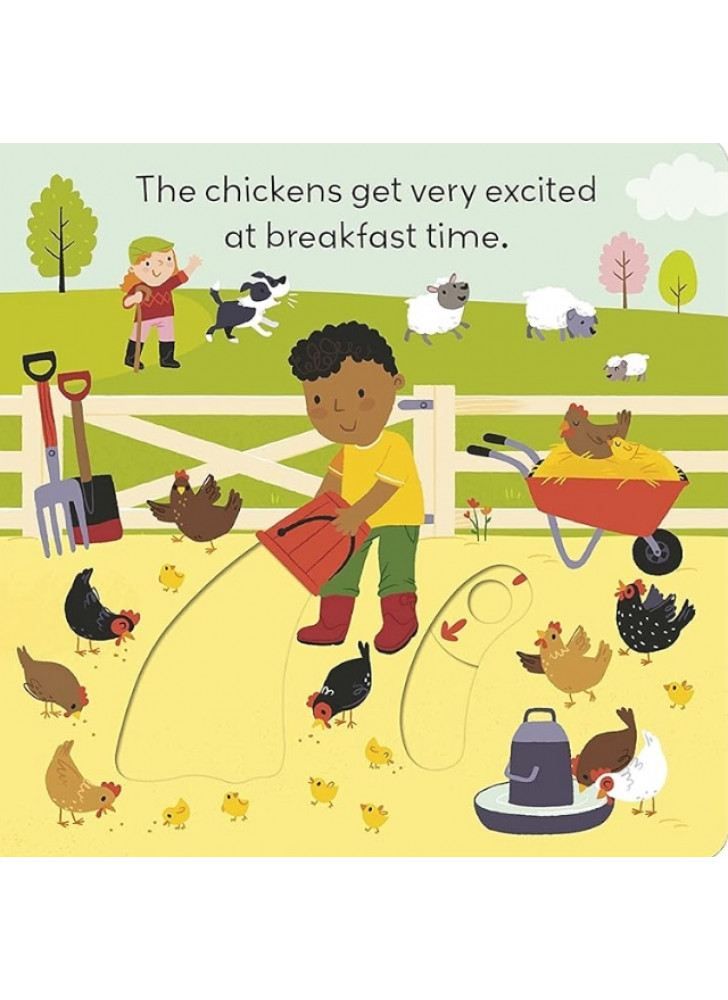 Ніжна розповідь ідеально підходить для читання вголос, супроводжуючи дітей через подвір’я ферми, коли вони допомагають годувати курей та орати поля. Незвичайна гірка, штовхання або потягування на кожному розкладному столі зацікавлять дітей, коли вони гулятимуть полями та спостерігатимуть за сільськогосподарськими тваринами. Яскраві ілюстрації Сема Мередіта та чарівні персонажі заохочують до взаємодії та гри, з безліччю цікавого, що можна побачити та насолодитися на кожному розкладному столі.