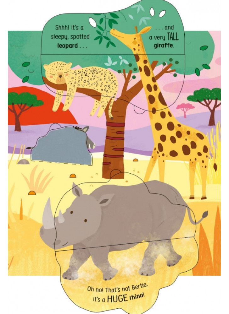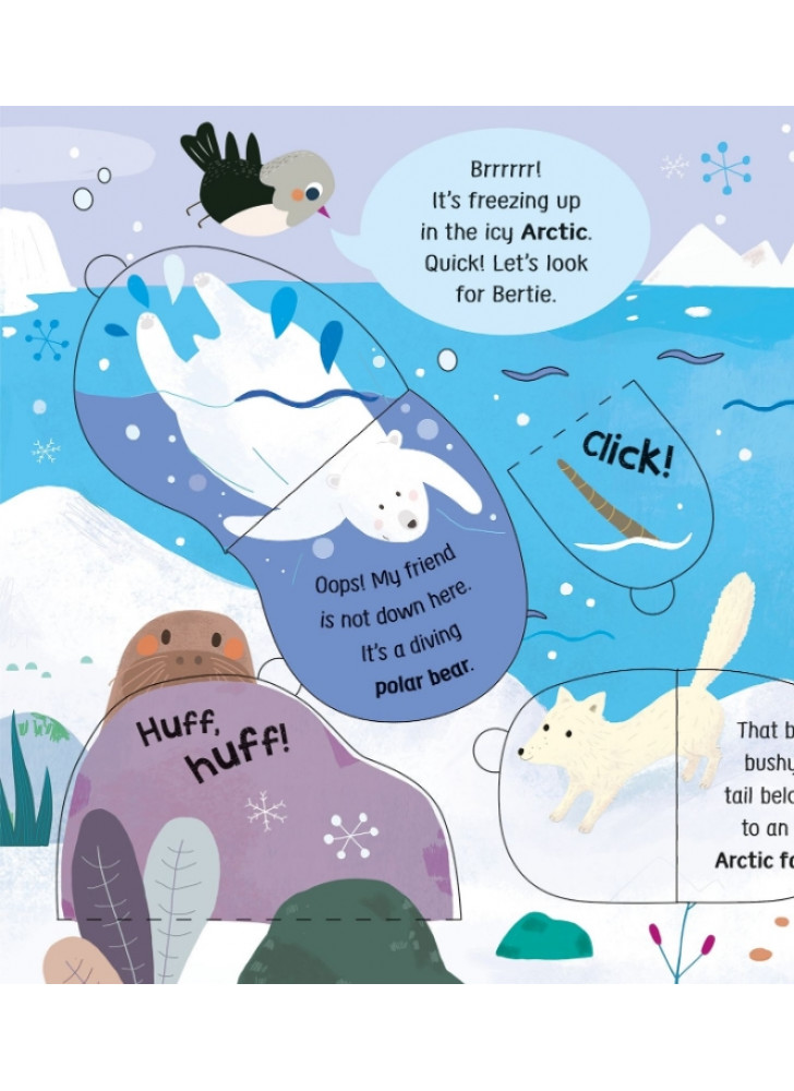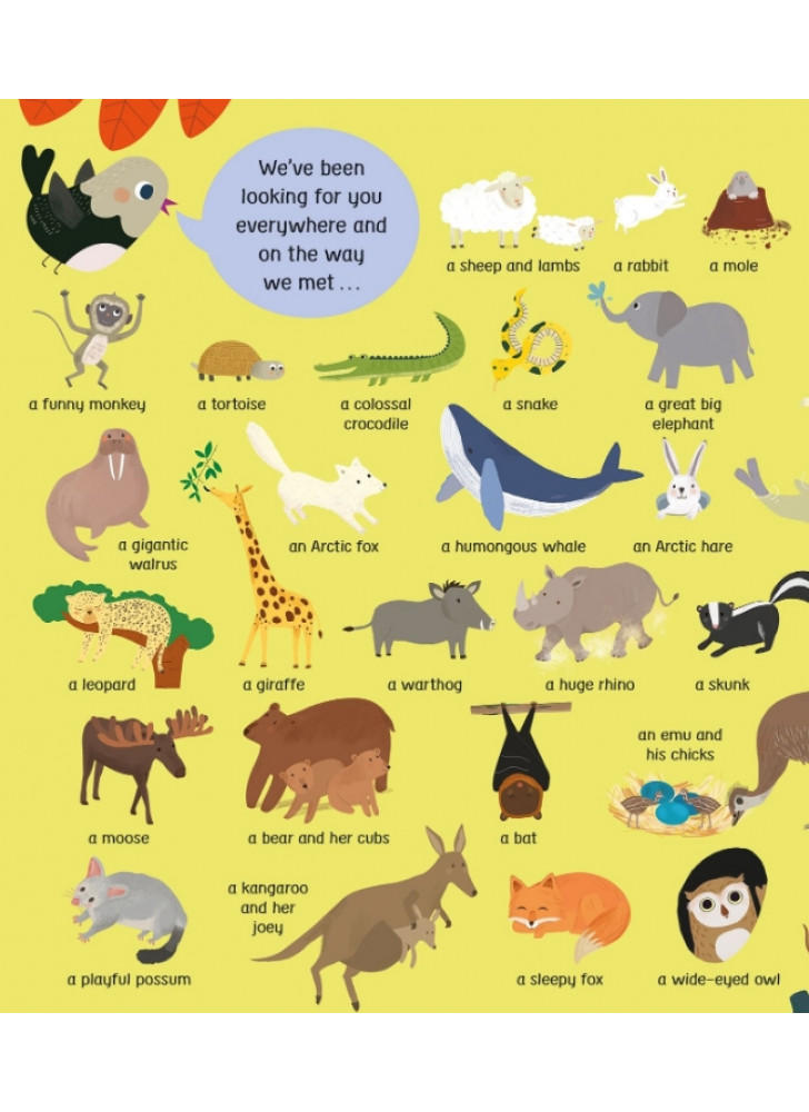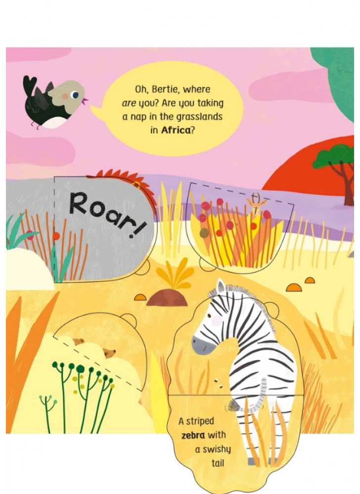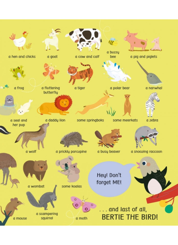 Маленька Пташка літає по всьому світу в пошуках свого друга Бьорті. Чи зможеш ти допомогти їй його знайти? На вас чекає безліч відкидних сторінок для допитливих ручок і 50 дивовижних тварин, з якими можна познайомитися. Від брудних поросят на фермі до слизьких змій у джунглях — відвідай неймовірні місця та вивчи нові слова під час пошуків.