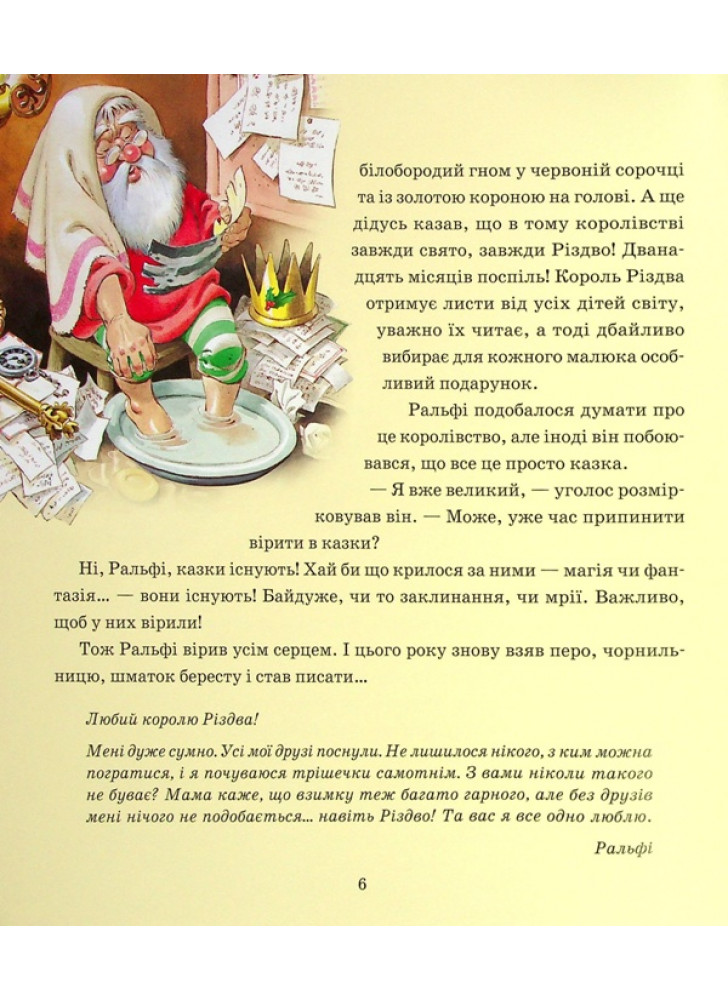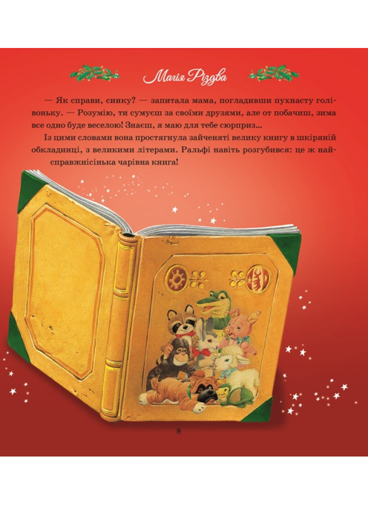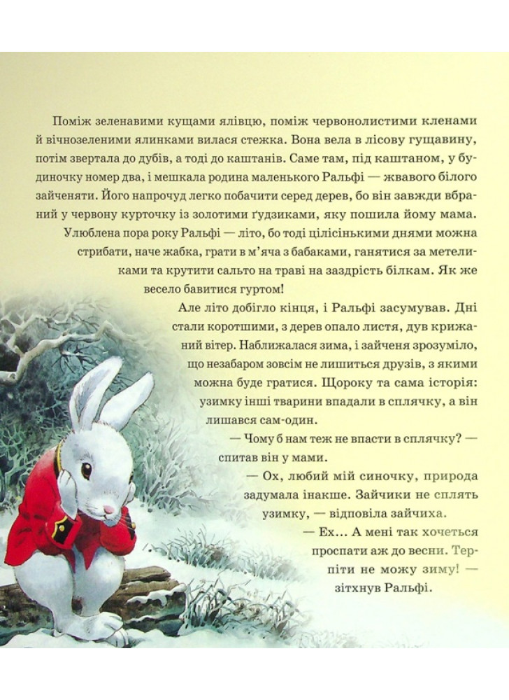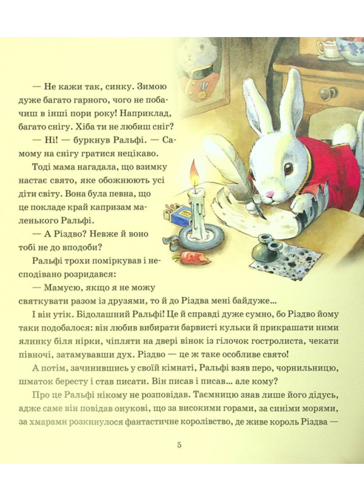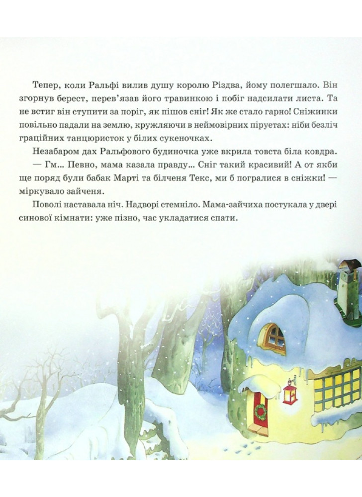 Настала зима, і всі радіють сніжку. До Різдва лишилися лічені дні, але зайчик Ралфі сумує. Що ж заважає маляті радіти прийдешньому святу? Виявляється, усі його друзі впали в зимову сплячку. А як можна радіти наодинці? Проте всім відомо: на Різдво здійснюються всі найпотаємніші мрії!.. Навіть зайчикові. Тож швидше розгорніть цю чарівну книжечку й вирушайте в казкову подорож разом із Ралфі й Королем Різдва