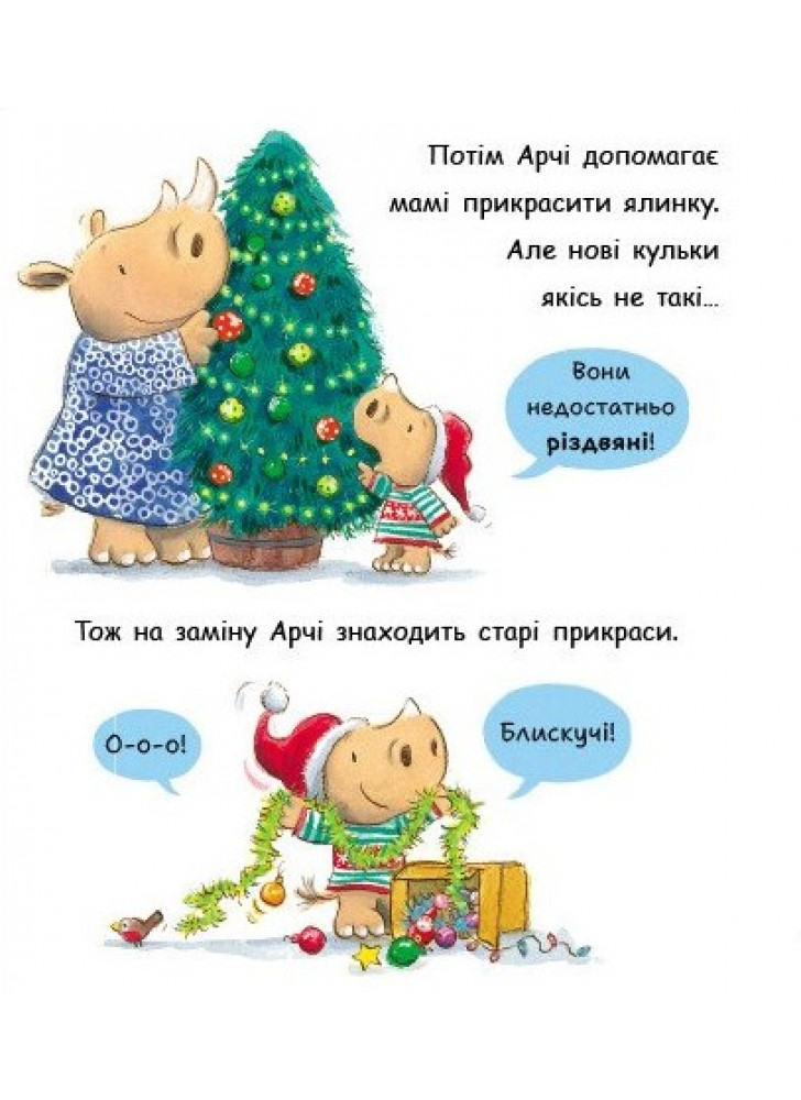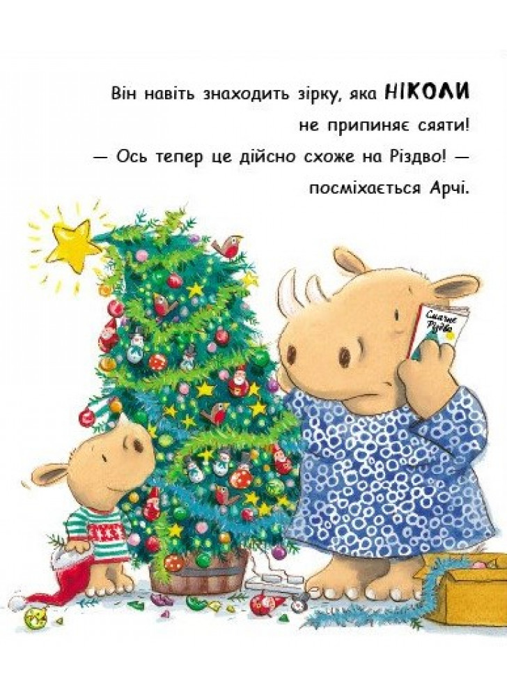 Різдво вже незабаром! І маленький носоріг Арчі готується до свята як ніхто. Він воліє зробити його найріздвянішим. Відтак прикрашає ялинку всім, чим тільки можна. Видобуває сніг, розірвавши крісло-мішок. І дещо плутає підписи подарунків для членів родини. Здається, малюк трохи перестарався. Та повірте, свято неодмінно буде чудовим. Весела книга про такого самого непосиду, як і ваша дитинка, принесе силу-силенну задоволення та святкового настрою.