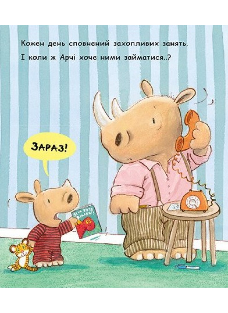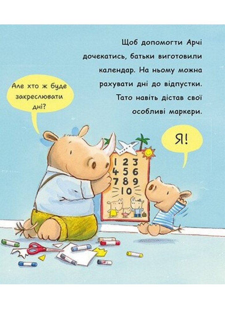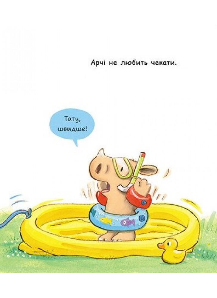 Ох, як же важко чекати... А надто, коли ти маленький. Татусь ніяк не надує басейн у садку. Черга на батут така довга. А до відпустки ще цілих десять днів! У носоріжці на ім’я Арчі батьки певно впізнають свого непосидючого малюка, який хоче отримати все тут і зараз. На сторінках книги оселилися веселі і такі життєві історії про маленького носорога та його батьків. Тож чому б не почитати книжку просто зараз?