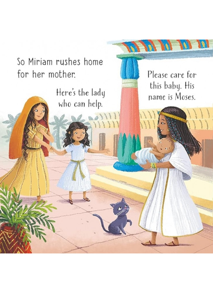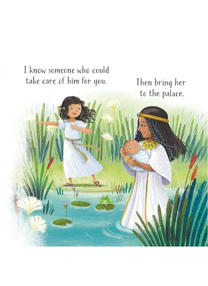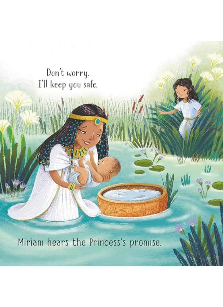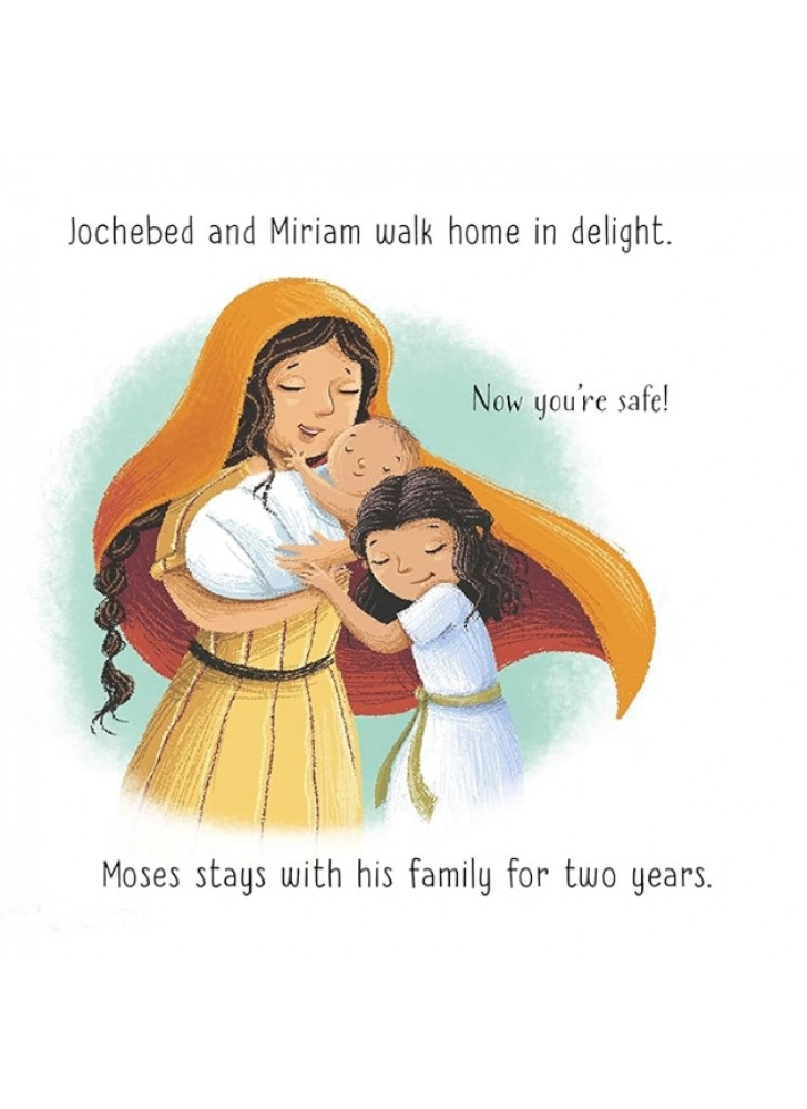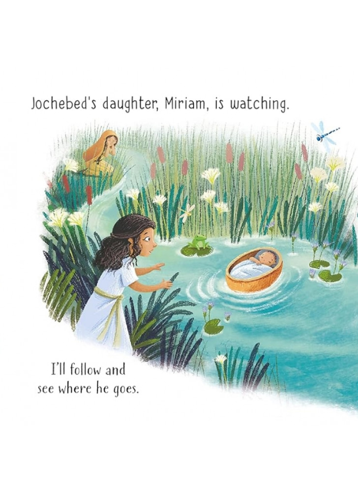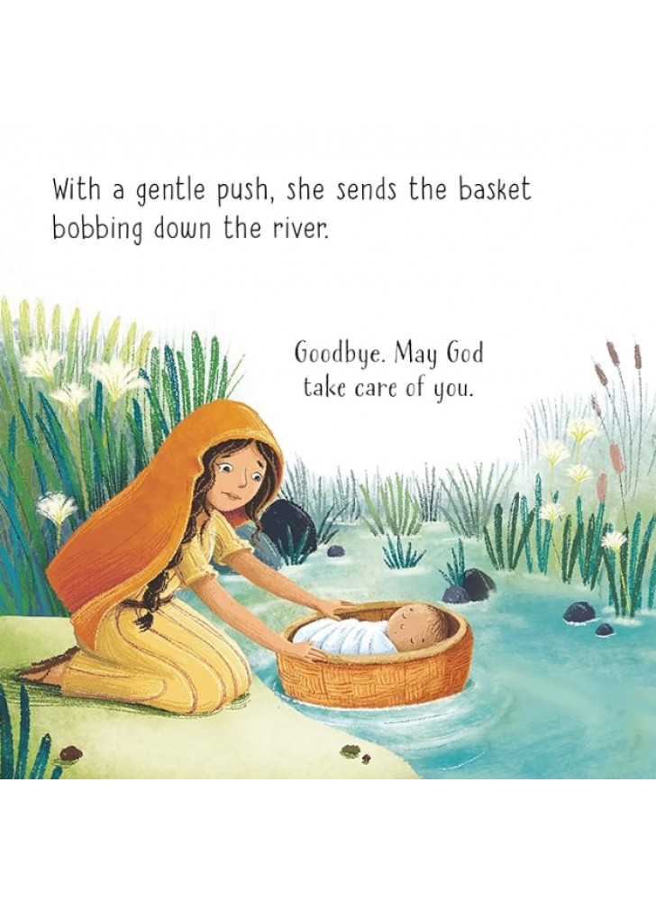 Мати Мойсея намагається врятувати свого сина від небезпеки, сховавши його серед очерету на березі Нілу. На щастя, його знаходить добра дочка фараона. Ця улюблена біблійна історія чарівно переказана та доповнена милими ілюстраціями Барбари Бонджині. QR-код веде до аудіозапису оповіді.