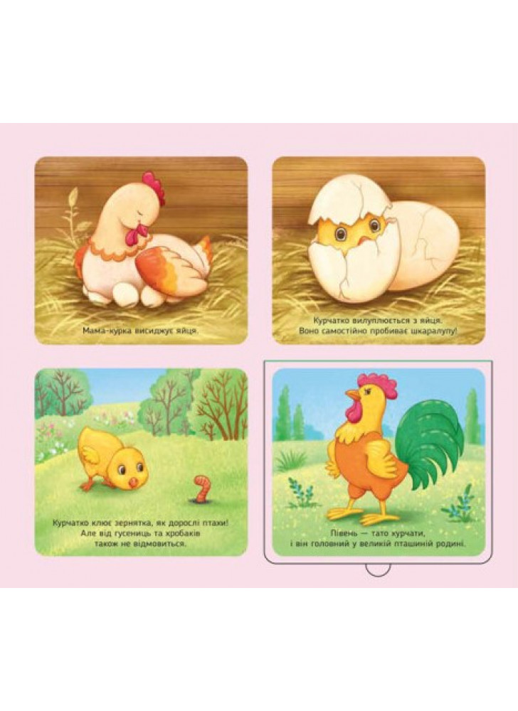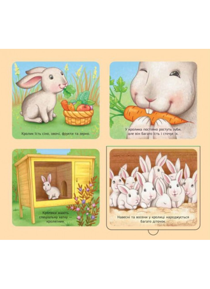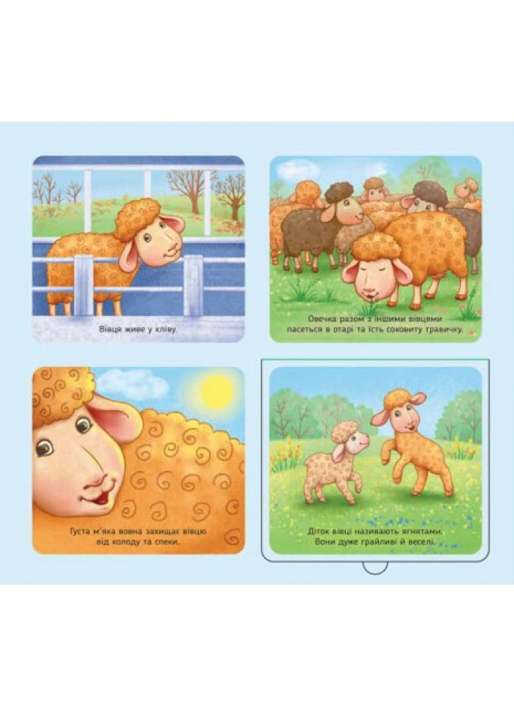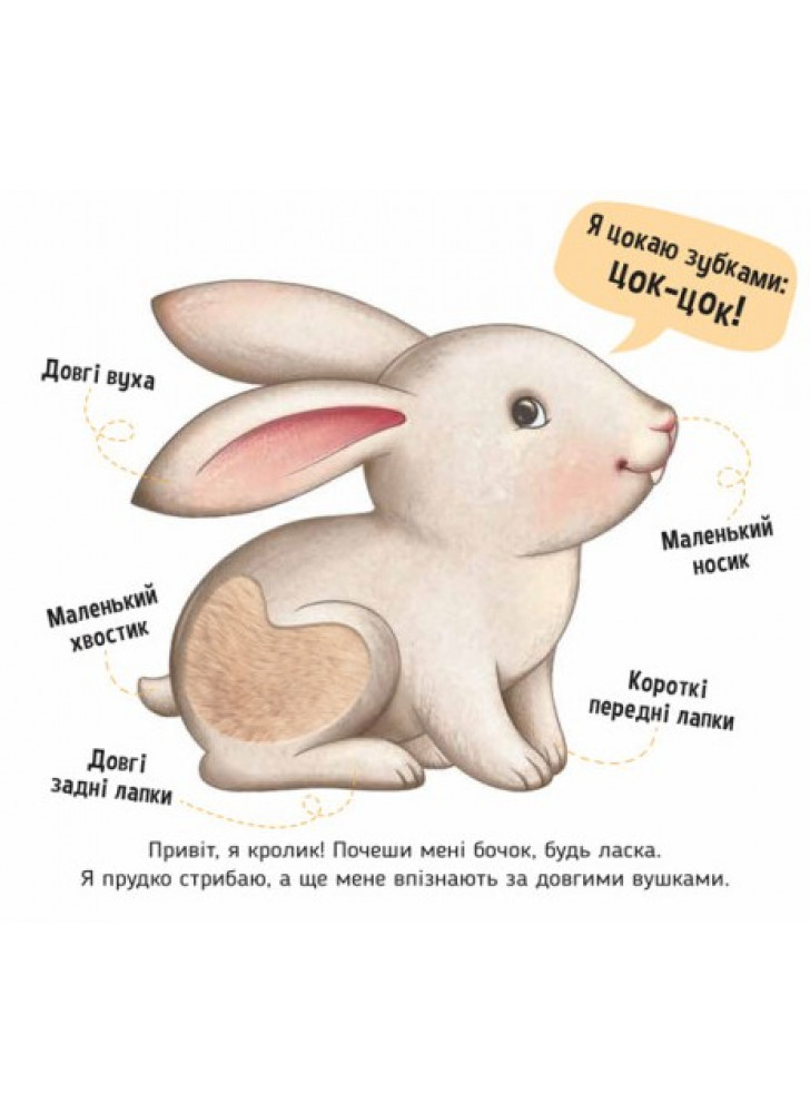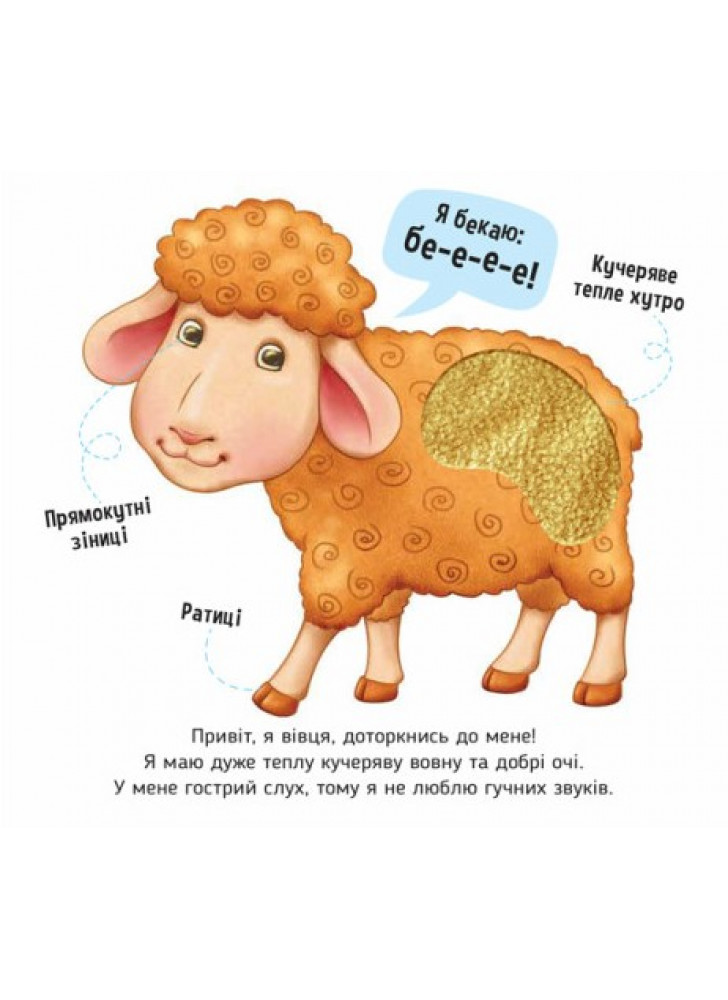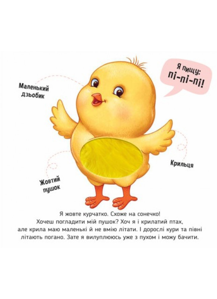 Настав час знайти нових друзів! Кролики, курчата, вівці та інші свійські тварини, що мешкають на сторінках цієї книжки, не тільки добрі та веселі, а й пухнасті. Кожну тваринку можна погладити і познайомитися з нею ближче. Малюк дізнається все найцікавіше про нового друга: що їсть, де живе Я які має вподобання. Окрім тактильної вставки, на кожному розворот дитину чекає таємне віконце.