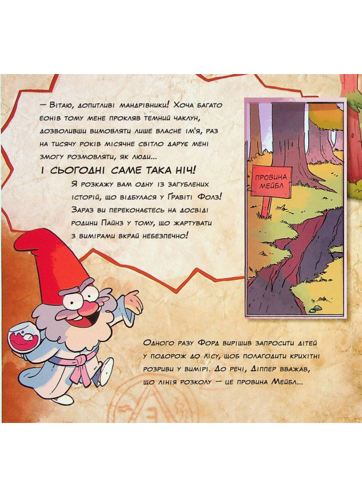 Десь далеко, там, куди майже не сягають сонячні промені, захована серед кущів ожини, пташиного співу та шепоту легенд... земля ГНОМІВ , не позначена на людських мапах! Серед них живе Шмебюлок - дивна істота із чудернацьким ім'ям. Сьогодні ти почуєш від нього про те, як небезпечно жартувати з вимірами і про чергові дивні пригоди родини Пайнз.