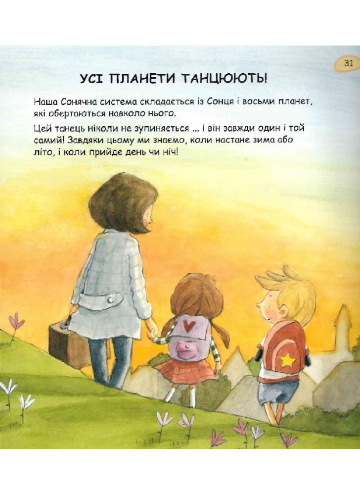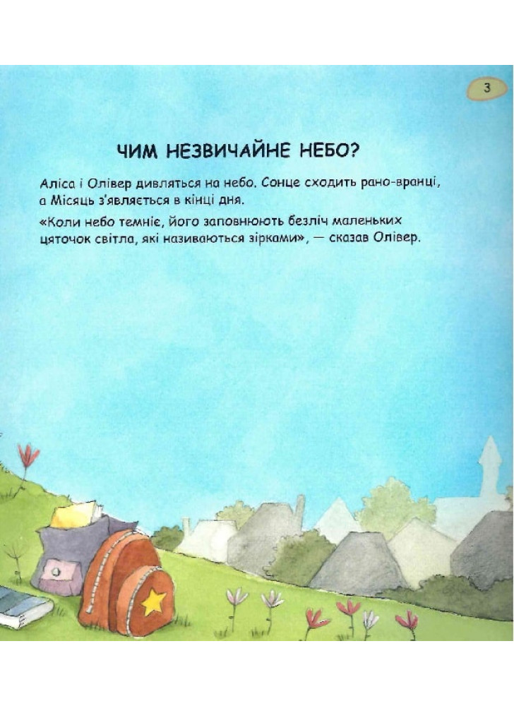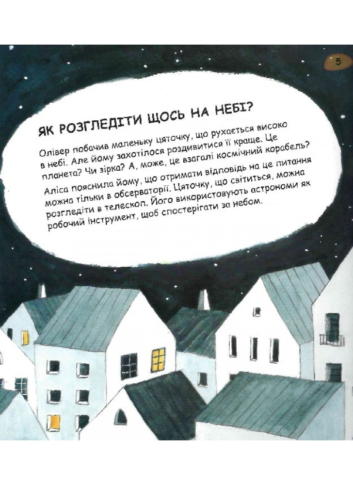 Коли Олівер і Аліса дивляться на небо, вони бачать Сонце, Місяць і мільйони зірок. Але небесних об'єктів набагато більше, ніж ми можемо побачити! З цієї цікавої книжки діти дізнаються багато таємниць про наш світ. Наприклад, про те, що планети нашої Сонячної системи, зокрема Земля, подорожують навколо Сонця.