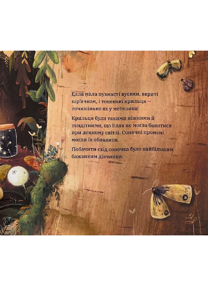 Надзвичайна історія про крихітну дівчинку Еллу. Тендітні крильця, вусики, як у метелика і серце, сповнене добра й любові до інших. Збираючи світло вночі, вона щедро ділилась ним з тими, хто потребував цього найбільше? Але ж добро має властивість повертатись до того, хто його випромінює, тож одного дня друзі Елли допоможуть її найбільшій мрії здійснитись: світло зірок перетвориться на світло…