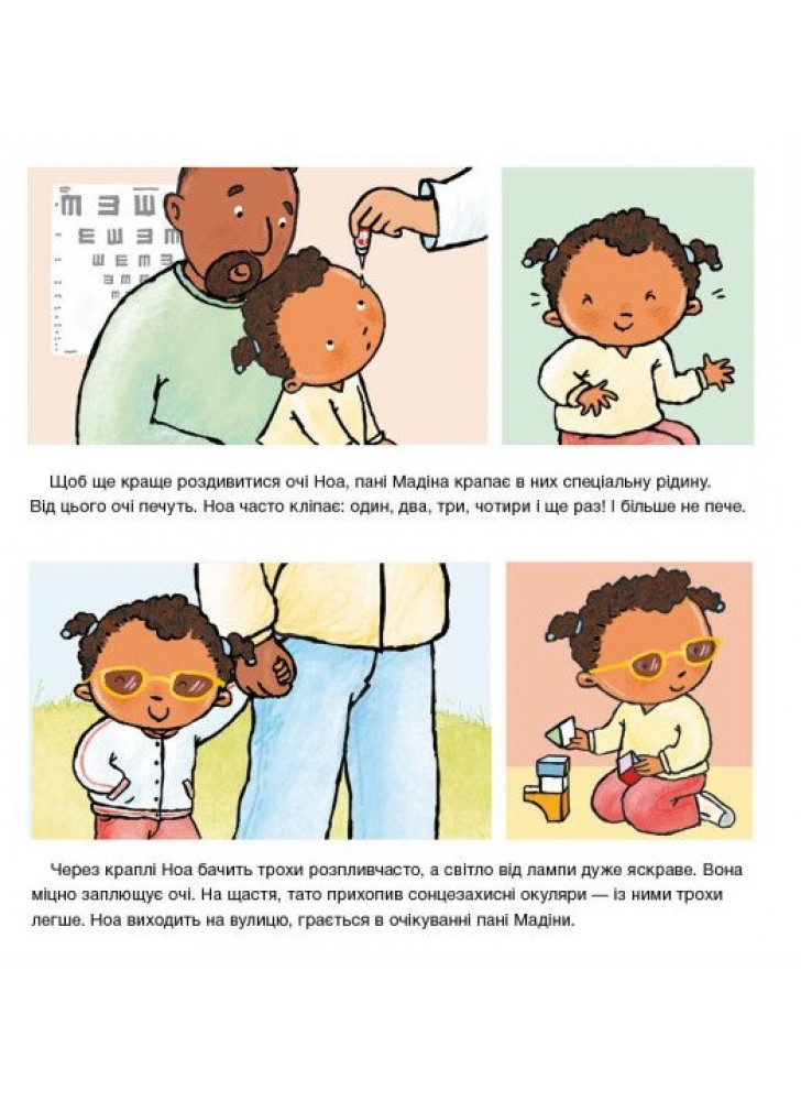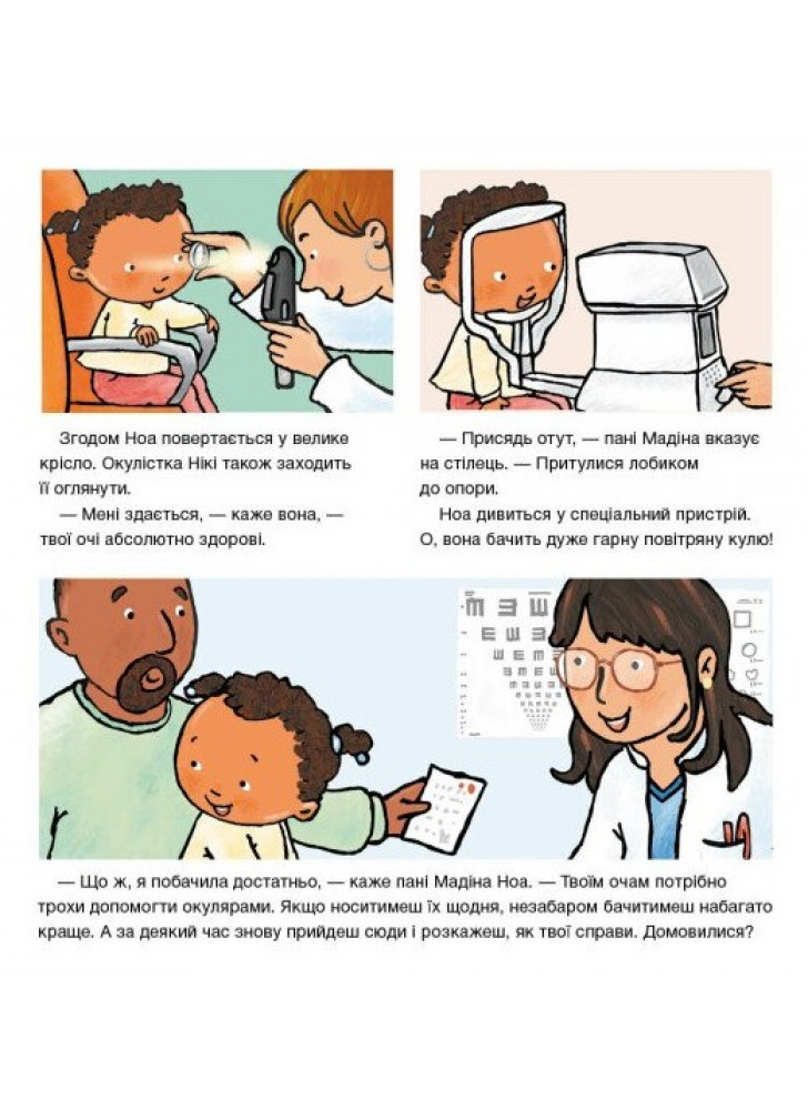 Ноа дуже хвилюється: вона йде перевіряти зір. Разом із лікарем вони виконують різні тести, щоб як слід обстежити очі дівчинки. Згодом Ноа приміряє різні окуляри й обирає найкрасивіші. Їй подобається носити окуляри, адже в них дівчинка знову все чітко бачить! Ця книжка пояснить дитині, як це: погано бачити і почати носити окуляри.