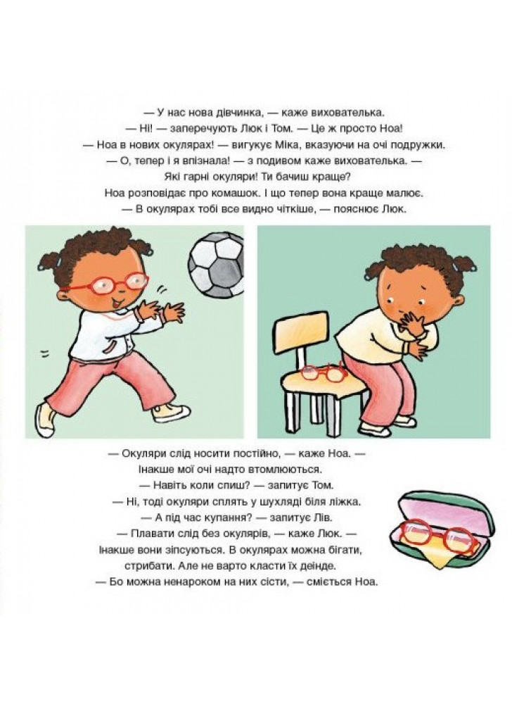 Книжка на важливу й непросту в поясненні тему: вади зору та окуляри. Книжка у формі історії про дівчинку Ноа розповість, чому люди носять окуляри й допоможе дитині з вадами зору адаптуватися до їхнього носіння.