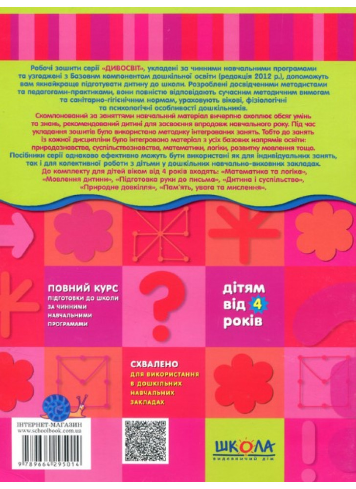 Робочі зошити серії «ДИВОСВІТ», складені за чинними навчальними програмами та узгоджені з Базовим компонентом дошкільної освіти (редакція 2012 року), допоможуть вам якнайкраще підготувати дитину до школи.