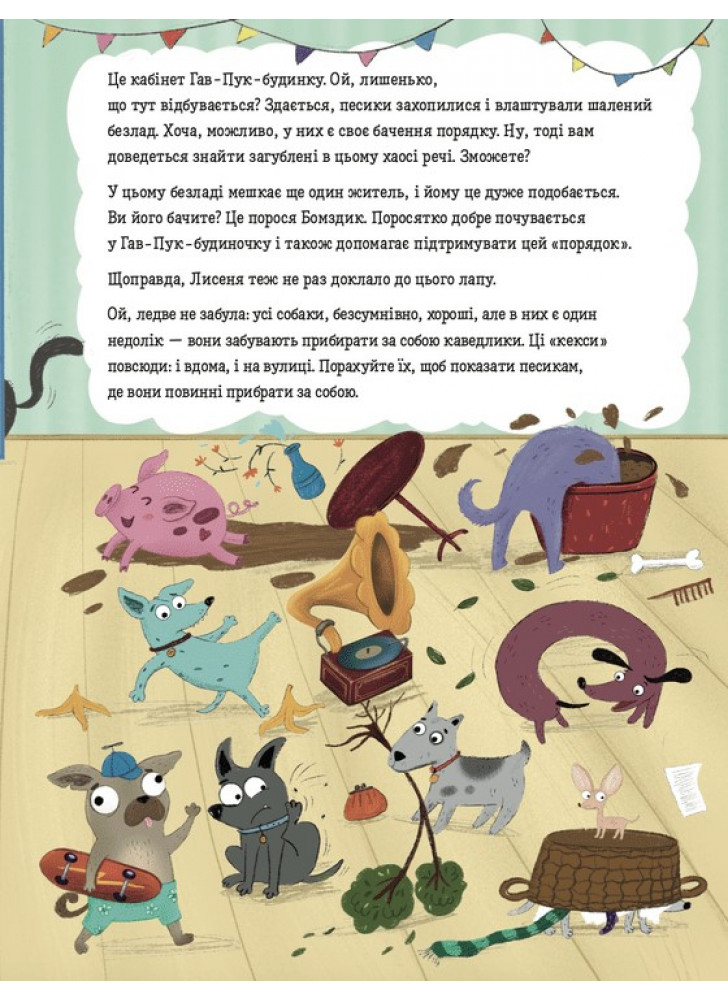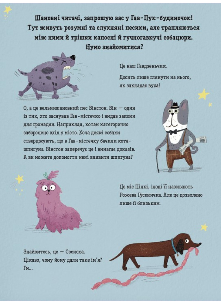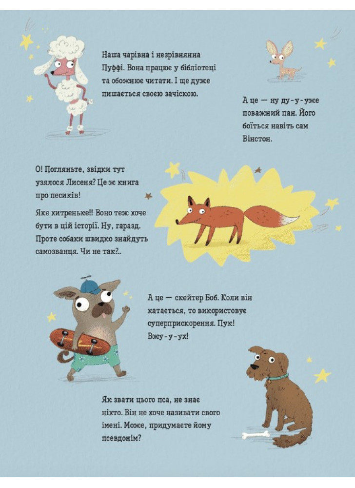 Віммельбух ідеально підходить для знайомства маленьких читачів зі світом довкола, розвитку мовлення і уяви. Діти радо розглядатимуть цю книжку про життя песиків, сповнену гумору і кумедних деталей. Адже на кожній сторінці потрібно знайти хитре Лисенятко, а також відшукати загублені предмети та собачі «кексики». Це чудова книга для сімейного читання і реготання.