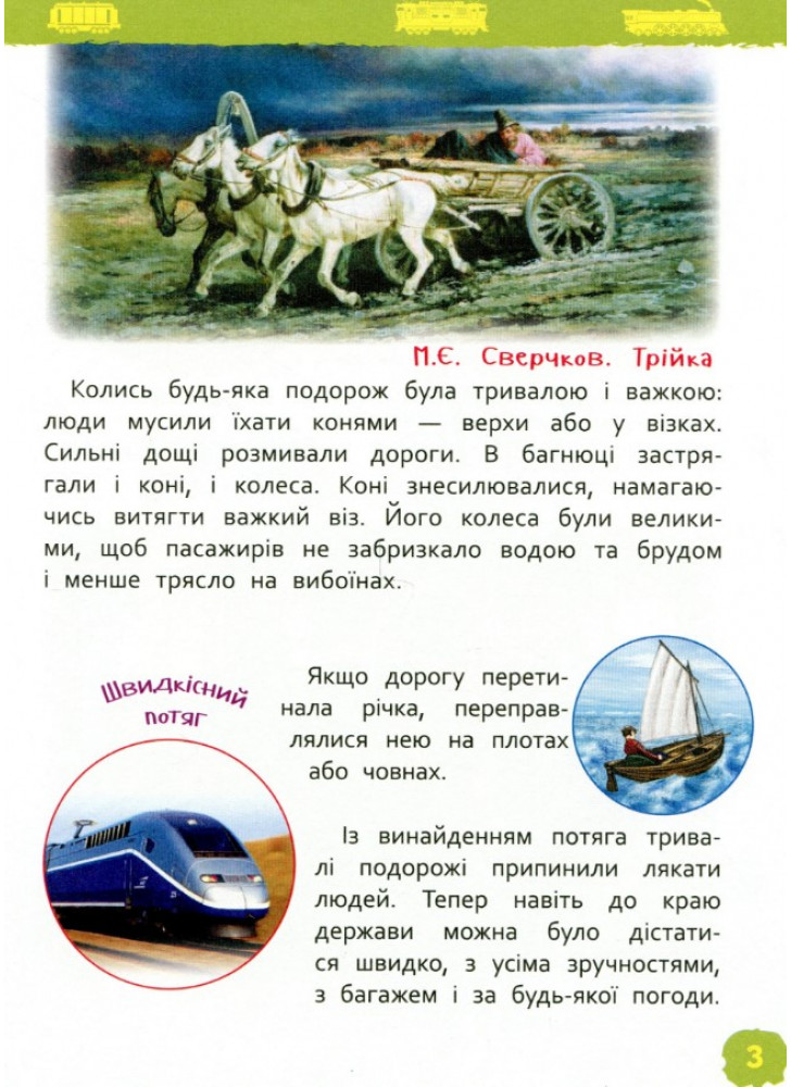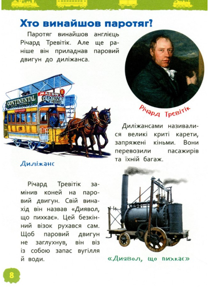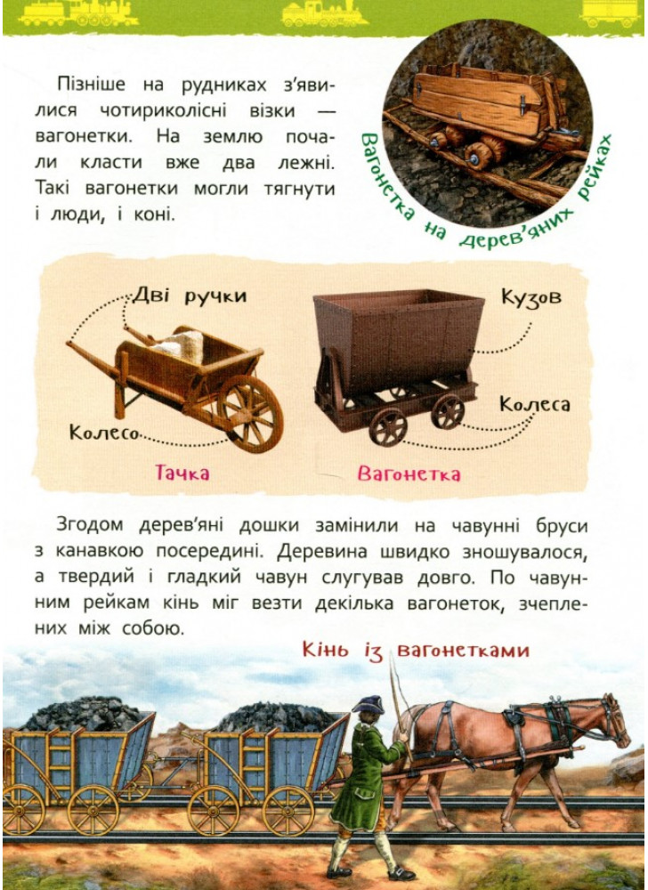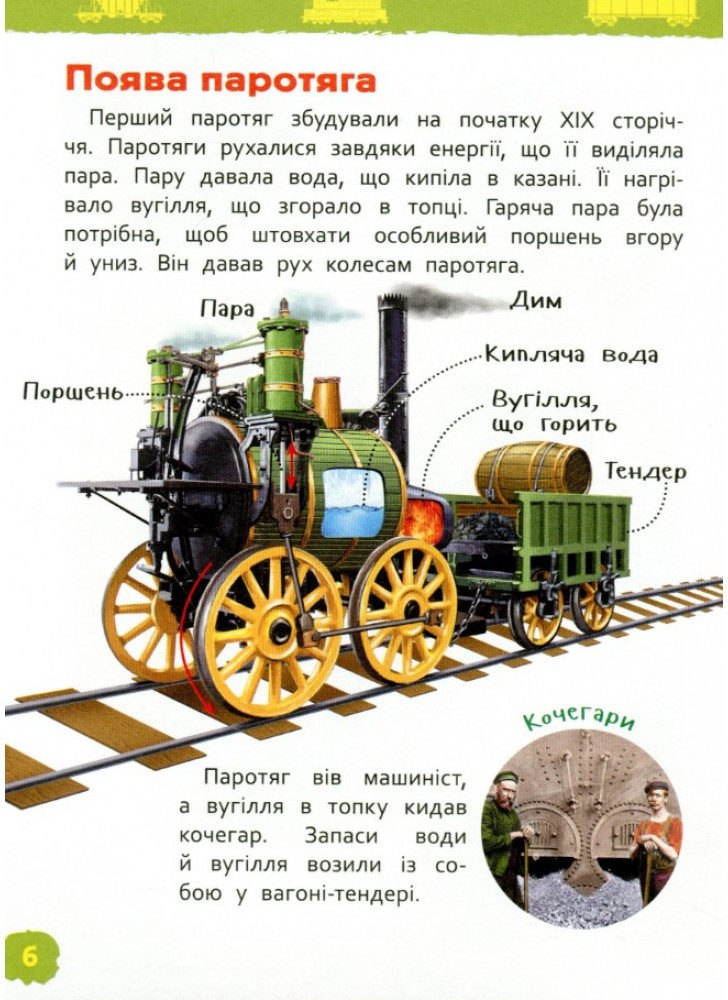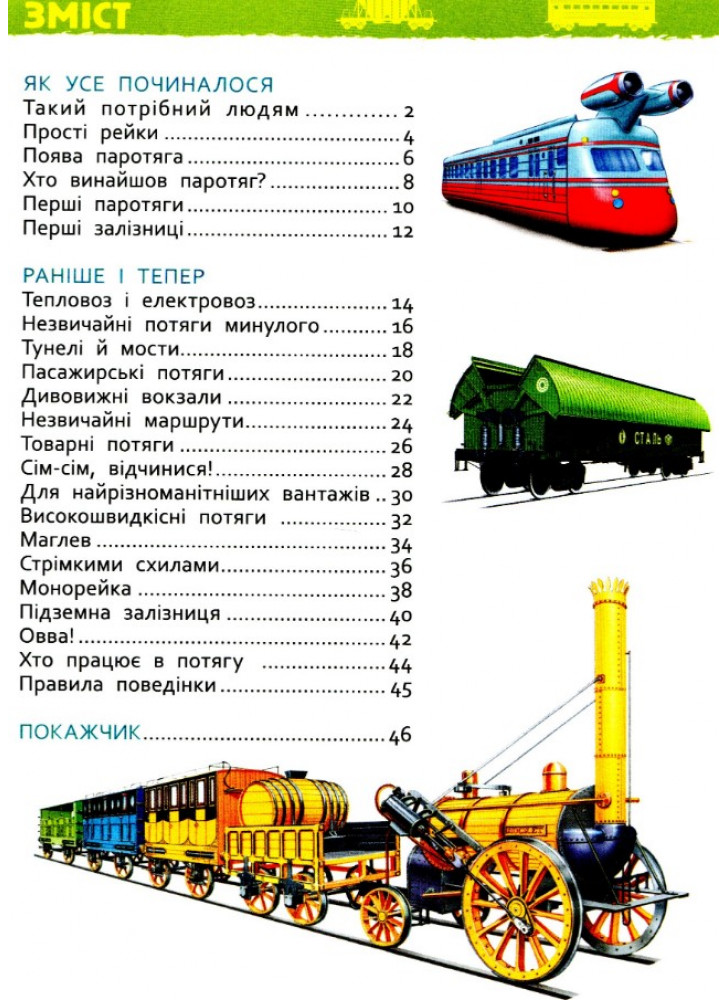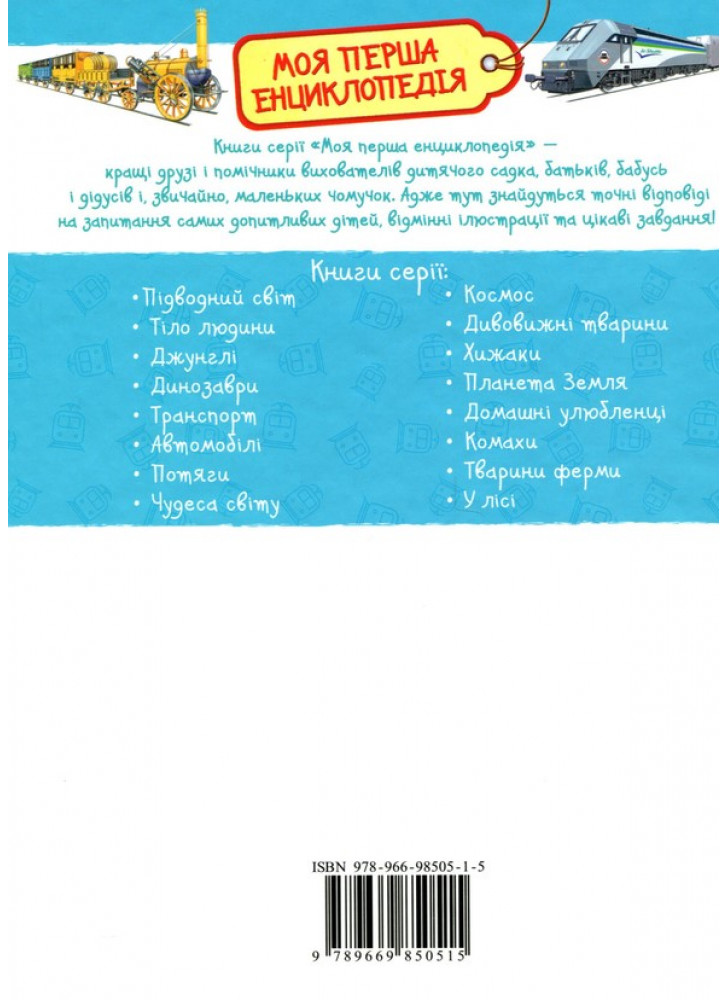 Книга серії «Моя перша енциклопедія» познайомить дитину зі старовинними та сучасними потягами. Вона дізнається, для чого придумали потяги, якими вони бувають, чим паротяг відрізняється від електровоза, а фунікулер — від канатної дороги.