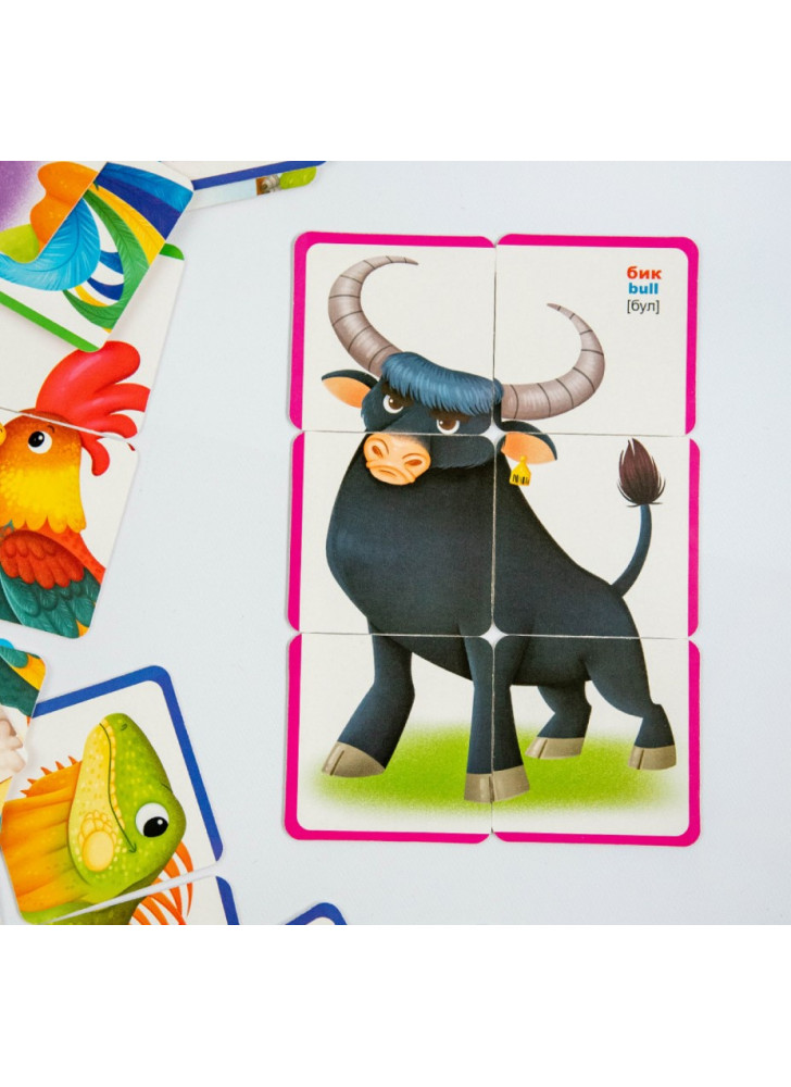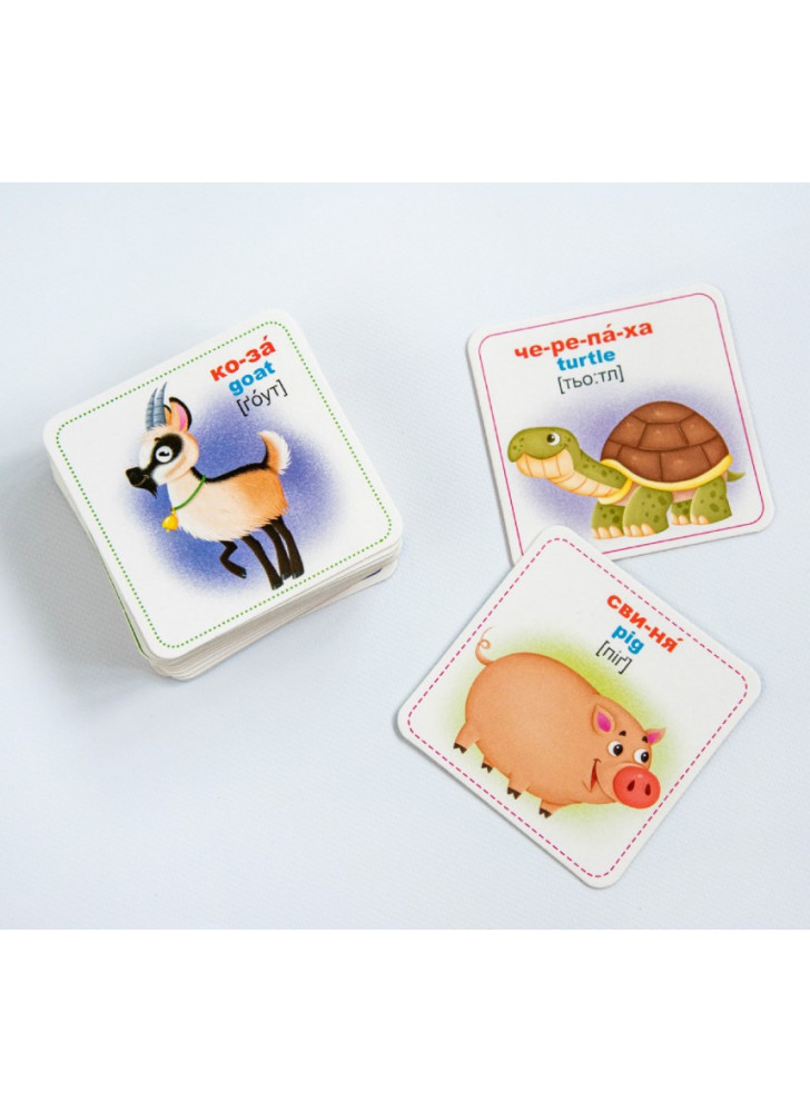 Знайомся із свійськими тваринами, вчи англійську мову, роздивляйся чудові малюнки, навчайся граючись! Перегляд таких карток дозволяє дитині швидко засвоїти назви тварин, запам’ятати як вони пишуться, розвиває у нього інтелект і формує фотографічну пам’ять.