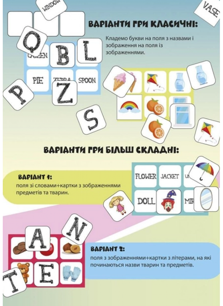 Завдяки цій грі дитина зможе вивчити слова англійською, і зрозуміти з якої літери починаються знайомі тварини та предмети. Поля та фішки містять зображення предметів, їх назви англійською мовою та перші літери назв. Можна вибрати кілька варіантів гри, окрім класичного!