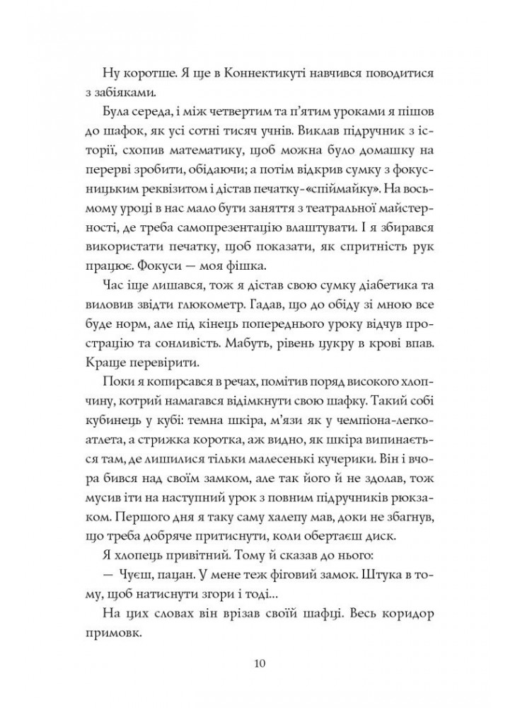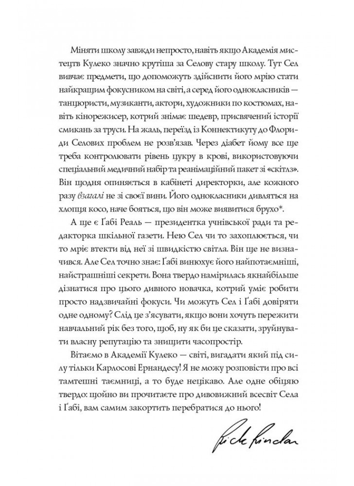 Може, розгадка в тому, що Сел — професійний фокусник? Та для цього трюку спритності рук замало, тут знадобилося особливе вміння хлопця, про яке ніхто не здогадується… Ніхто, крім Ґабі — президентки учнівської ради, редакторки шкільної газети і за сумісництвом адвокатки Ясмані, яка примчала до директорки захищати свого підопічного. Коли дівчина дізнається, що новачок здатен на значно більші трюки, ніж сира курка в шафці, то сприймає це… досить спокійно. І стає напарницею Села.