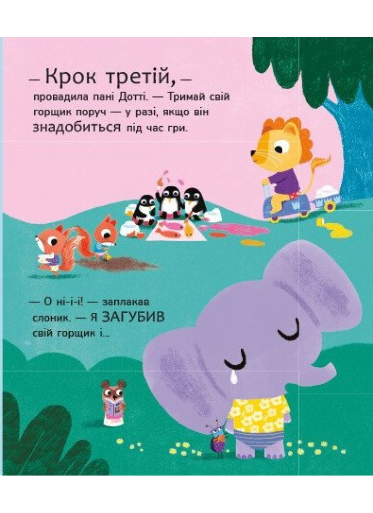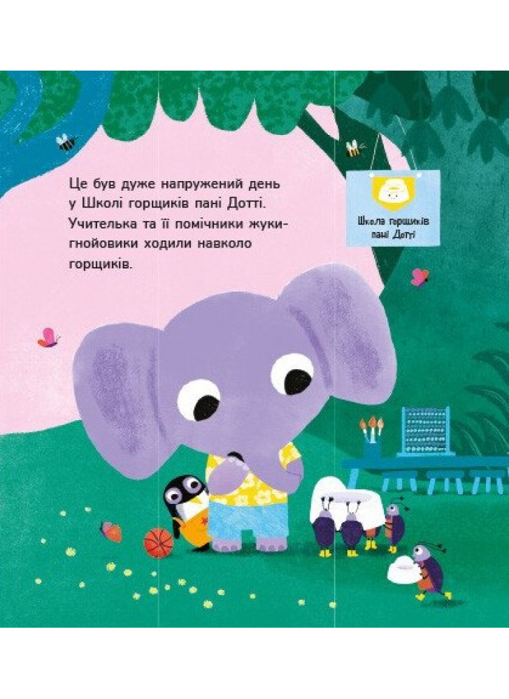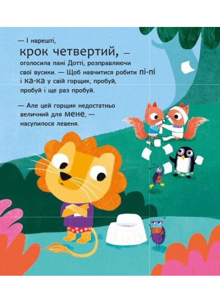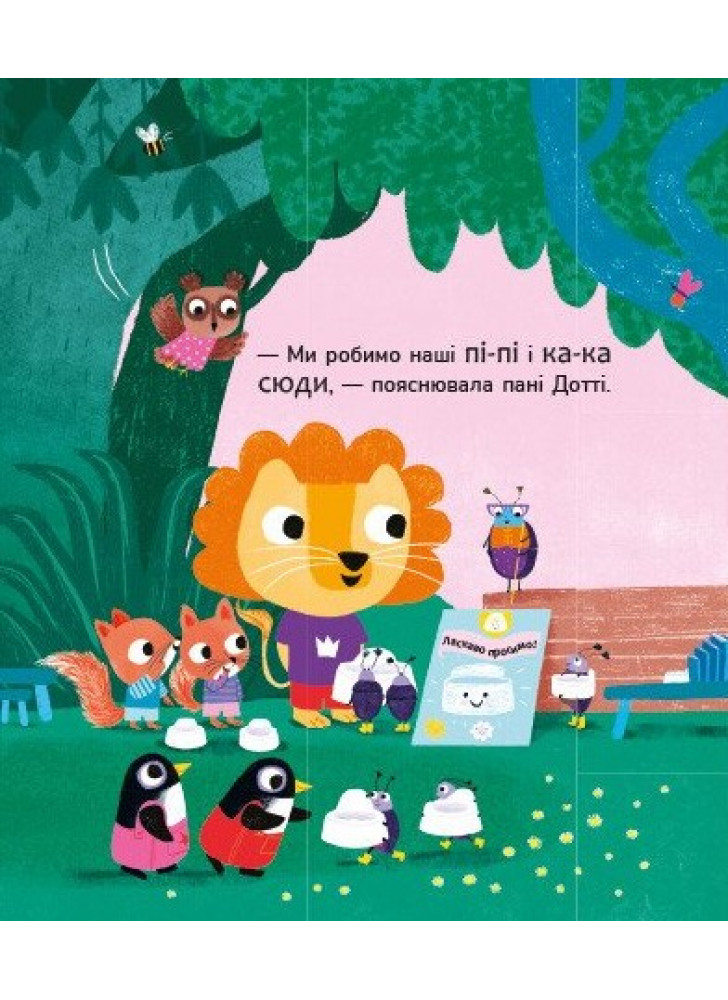 Час привчатися до горщика — і вчителька пані Дотті поспішає на допомогу! Долучайтеся до її класу. Звірятка вже прощаються із підгузками та вчаться любити свої горщики. Сповнена пі-пі та ка-ка, ця книжка ідеально підходить для малюків, які вчаться користуватися горщиками. Книжка лагідно зацікавить малюка й спонукає почати користатися горщиком. Авторка Трейсі Кордерой — відома творчиня дитячих книжок із розвитку, отримала чимало нагород за свій доробок.
