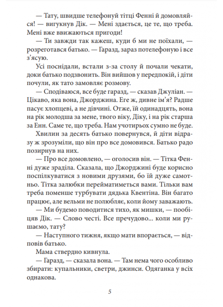 А коли кузени ще й дізналися, що Джорджа має власний острів з руїнами старого замку, затонулий корабель та чудового собаку Тіммі, всі вони з головою поринули у захопливі пригоди, перетворившись на шукачів скарбів.