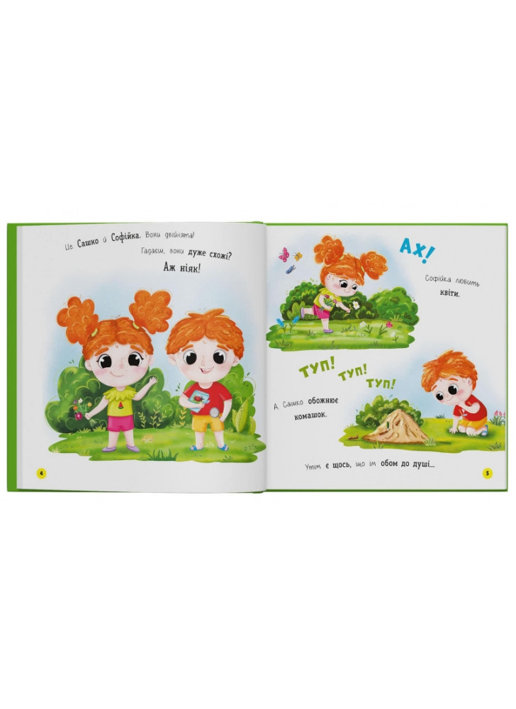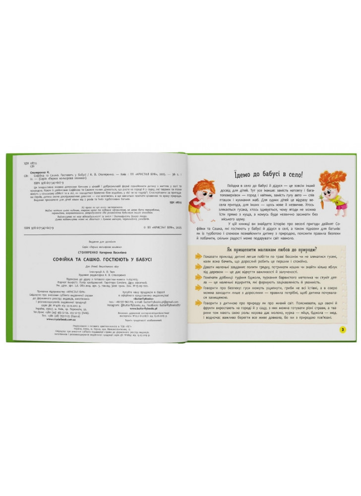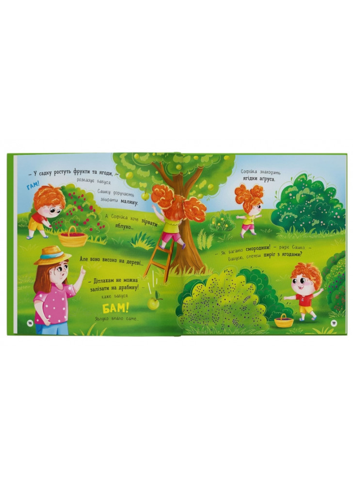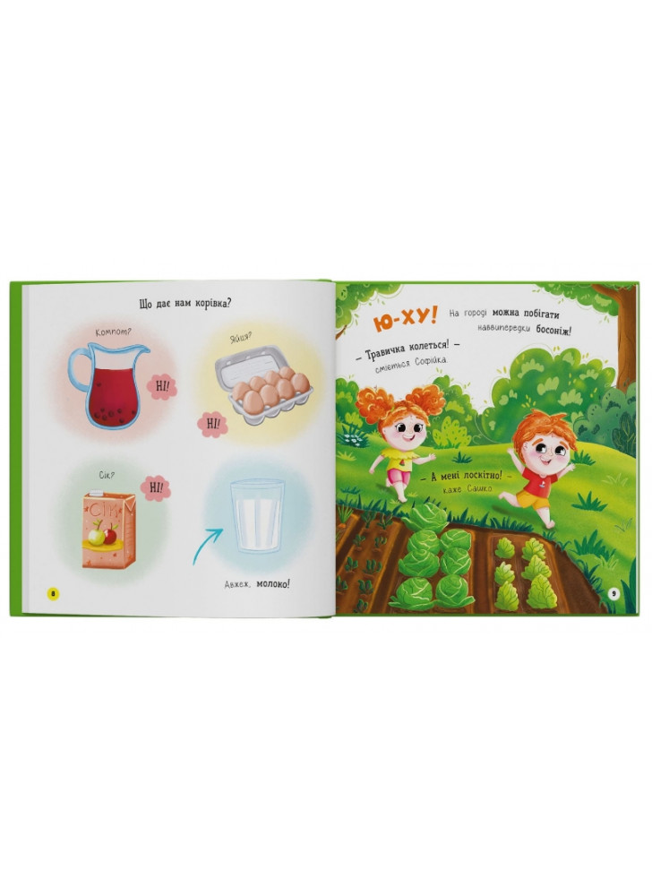Ця інтерактивна книжка допоможе батькам у цікавій і доброзичливій формі познайомити дитину з життям у селі та природою. Разом із двійнятами Софійкою та Сашком малюк дізнається, що росте на городі й у садку, які тварини та птахи живуть у сільському обійсті та в лісі, як поводитися безпечно біля водойми, у лісі чи на подвір’ї.