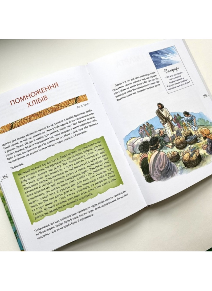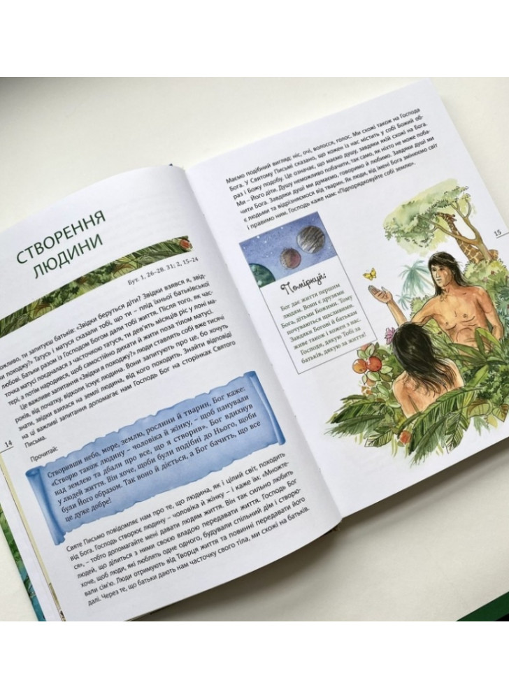 Окрім біблійних історій, Ви знайдете багато кольорових ілюстрацій та карт, прості коментарі, різні запитання та молитви, які допоможуть дитині краще пізнати світ Біблії. Також Святе Письмо стане найкращим подарунком для дитини з нагоди Урочистого Святого Причастя.