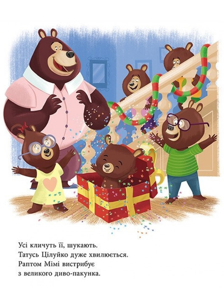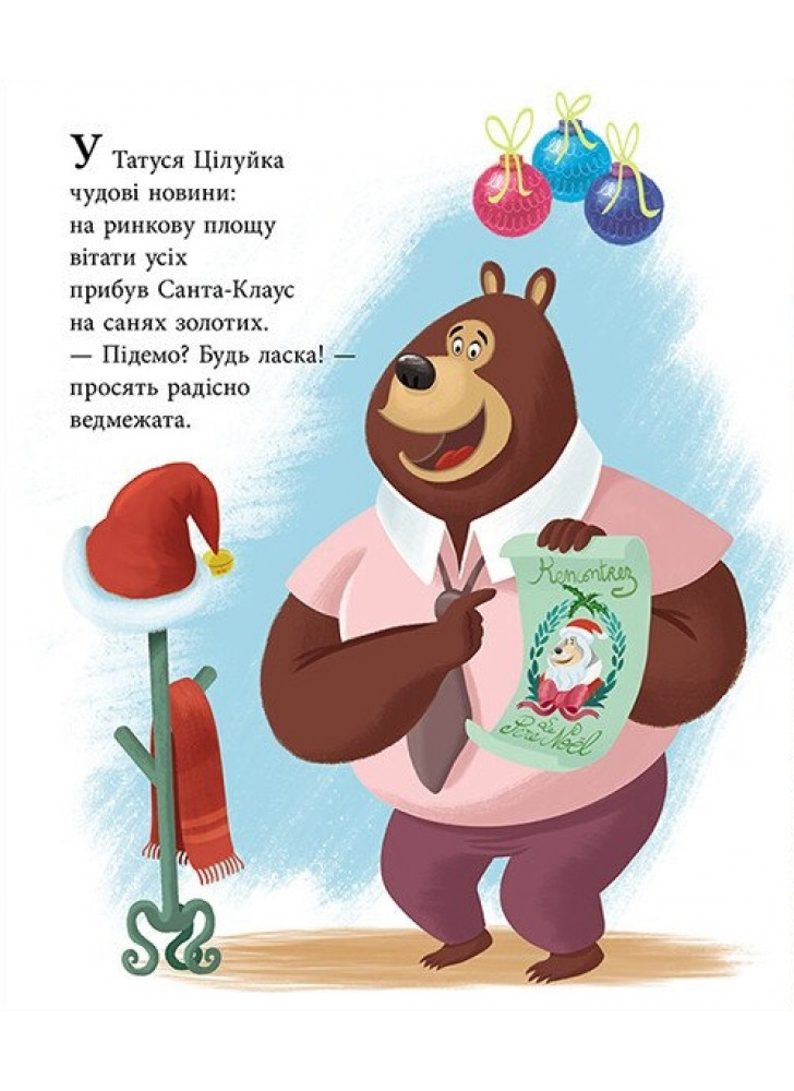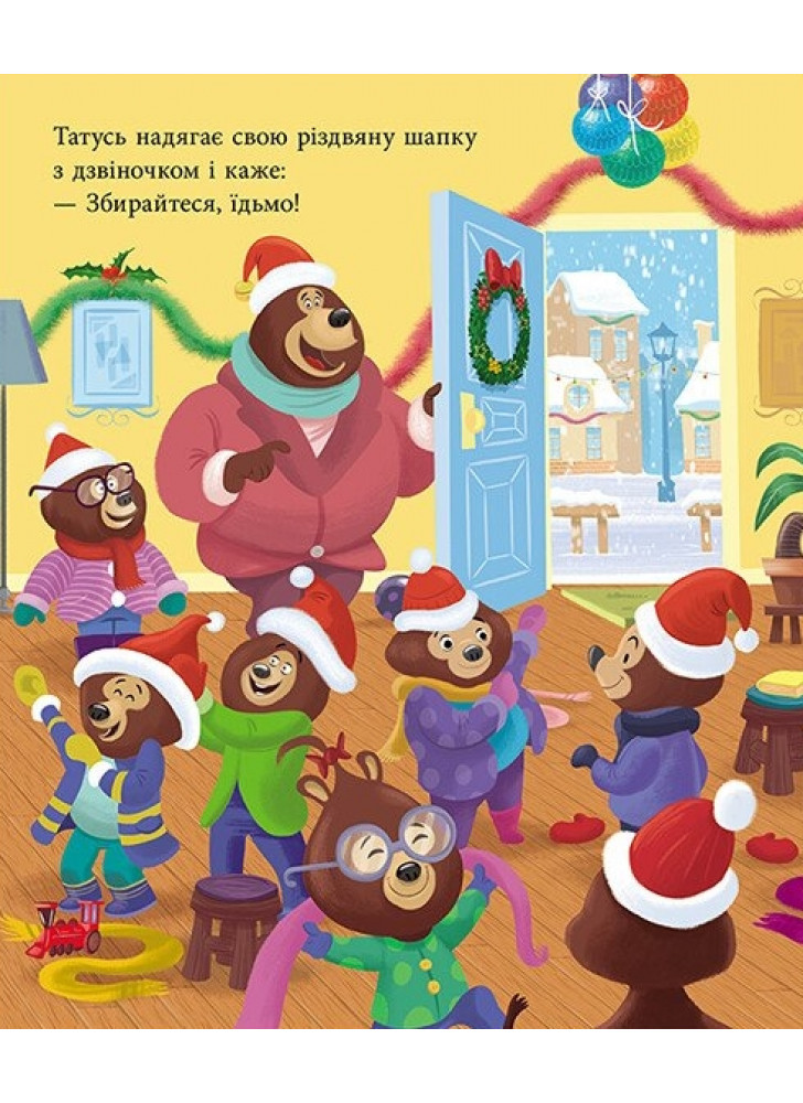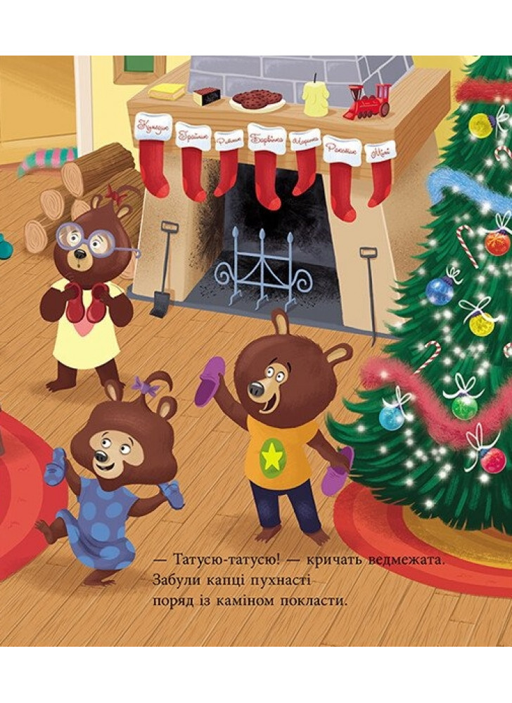 Історія французької письменниці Карін-Марі Амйо про теплі родинні стосунки тата-ведмедя і його ведмежат. Татусь Цілуйко і сім ведмежат з нетерпінням чекають на Різдво. Вони зустрічають на ринковій площі Санта-Клауса, співають колядки, прикрашають ялинку й складають списки подарунків…