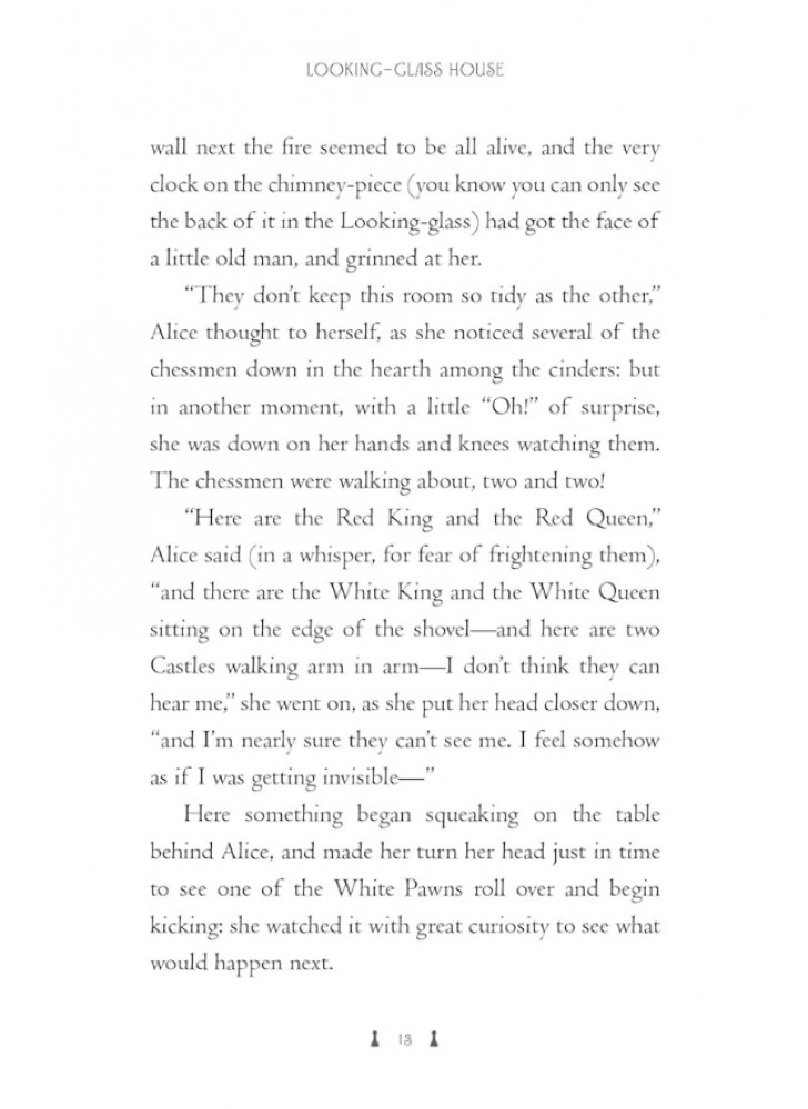 Чарівне подарункове видання «Аліси у Задзеркаллі». У своїй другій пригоді Аліса проходить крізь дзеркало — до ще дивовижнішого світу, ніж Країна Див. Вона опиняється всередині великої шахової партії та вирушає в подорож, щоб стати королевою. Але все виявляється не так просто, як здавалося: на кожному кроці їй заважають химерні персонажі, які з’являються нізвідки та наполягають на декламуванні віршів.