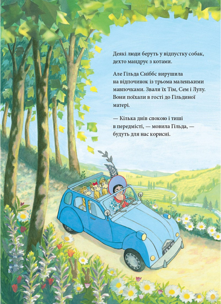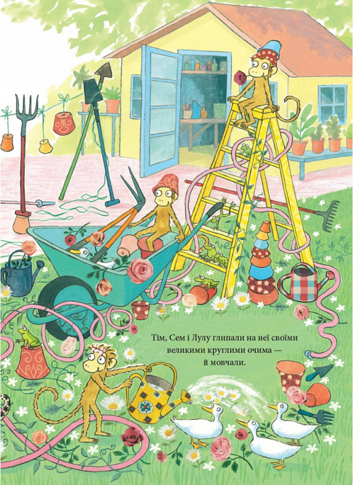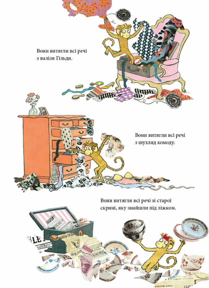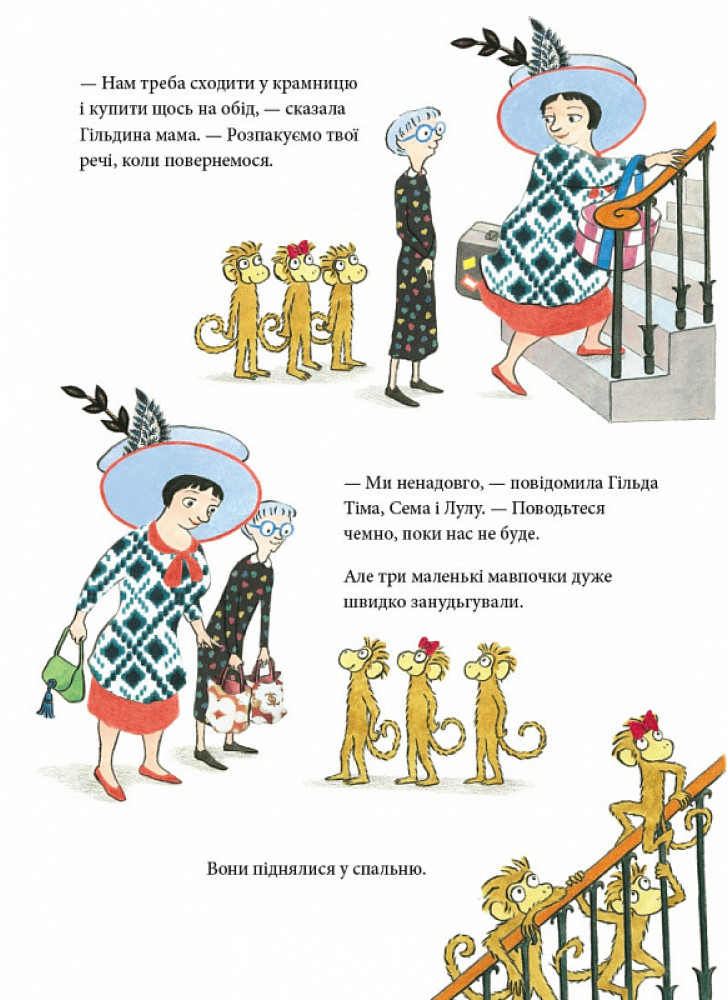 Буває, люди беруть із собою у відпустку своїх улюбленців. У когось це собака, у когось — кіт. А Гільда Сніббс взяла своїх трьох маленьких мавпочок. Їх звати Тім, Сем і Лулу. Гільда поїхала в гості до своєї мами. Це мали бути спокійні й затишні відвідини… Але коли кудись вирушаєш із трьома мавпочками, готуйся до несподіванок!