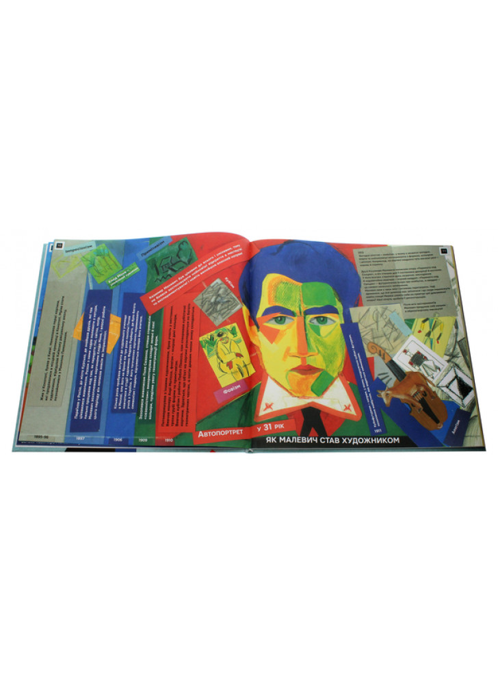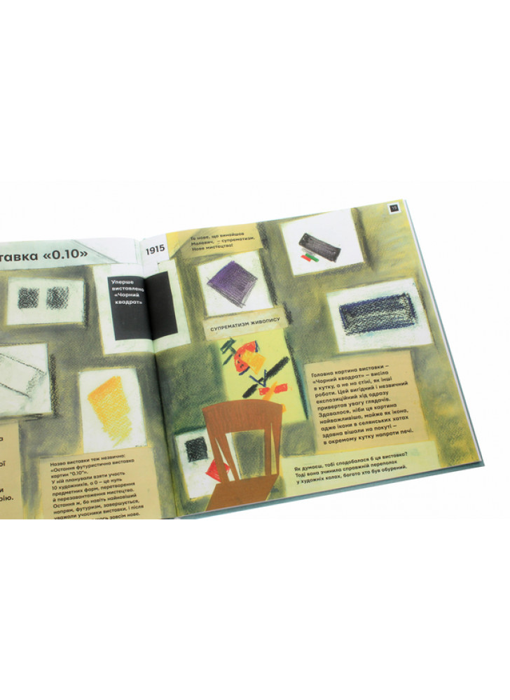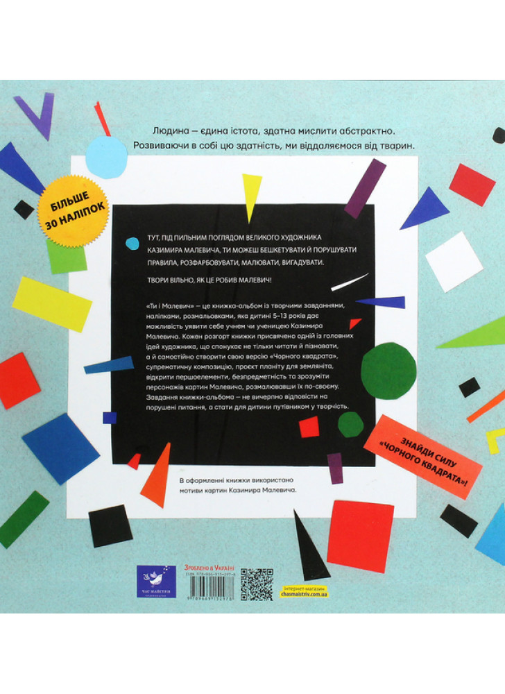 Завдання книжки-альбома — не вичерпно відповісти на порушені питання, а стати для дитини путівником у творчість. Тут, під пильним поглядом великого художника Казимира Малевича, ти можеш бешкетувати й порушувати правила, розфарбовувати, малювати, вигадувати. Твори вільно, як це робив Малевич!