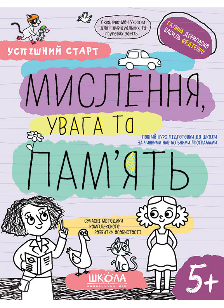 Мета зошиту: комплексний розвиток уваги, пам’яті та різних видів мислення у дітей шостого-сьомого року життя. Сучасні, цікаві, доступні, актуальні завдання скомпоновані за принципами цілісності, системності, послідовності, поступового ускладнення, закріплення та повторення матеріалу. Зошит укладено за чинними програмами розвитку дитини та Базовим компонентом дошкільної освіти. До занять із розвитку мислення, пам’яті та уваги включено матеріал із природознавства, підготовки руки до письма, математики тощо. Герої зошита — котик та мишка, перетворять заняття на веселу й цікаву гру.