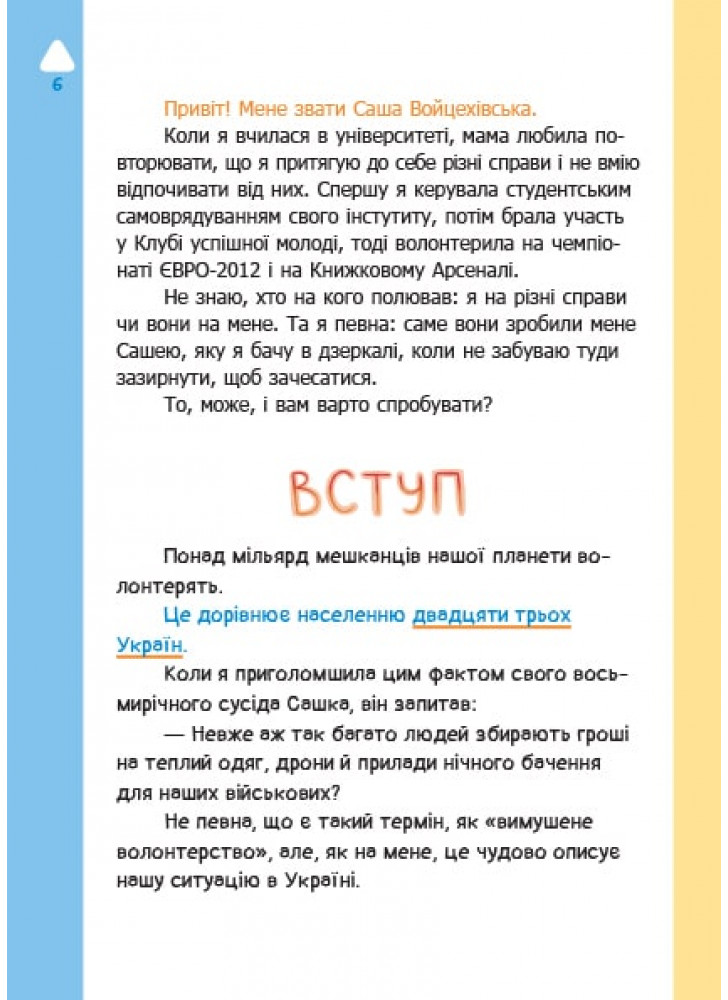 Авторка Саша Войцехівська легко та глибоко пояснює, хто такі волонтери і які цінності та навички потрібні для цього виду роботи. Вона також розповідає про те, як кожна дитина може стати частиною позитивних змін у світі через власну активну участь. Ця книга надихає юних читачів на дії та допомагає їм розуміти, що навіть маленькі кроки можуть мати велике значення для інших і для світу в цілому.