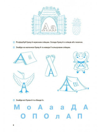 На сторінках ви знайдете різноманітні цікаві завдання: з пошуку заданої літери; зі зʼєднанням відповідних букв; з розфарбовками; творчі завдання; пошукачі та багато іншого! Усе, що потрібно для роботи з зошитом, — кольорові олівці, пластилін або інший матеріал для творчості, та 10–15 хвилин на день для цікавих занять!