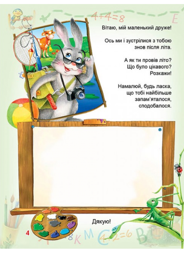 Одне слово, на вас і вашу дитину чекають на сторінках книги «Вчимося і граємо» не звичайні стандартні вправи, що вже набили оскому, а веселі літні пригоди Зайчика! Наприклад, попросить Зая намалювати, що запам’яталося цього літа. Як це здорово — намалювати і розфарбувати прямо в книжці свій літній веселий старт. А ще можна похвалитися зайченяті, — у нас це можна! — як ми освоїли абетку, навчилися рахувати і розв’язувати приклади, писати літери і цифри у прописах. Не навчилися? Нічого, навчимося! Разом із кумедним зайцем та його друзями вчитися — саме задоволення.